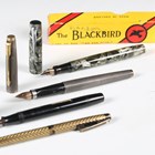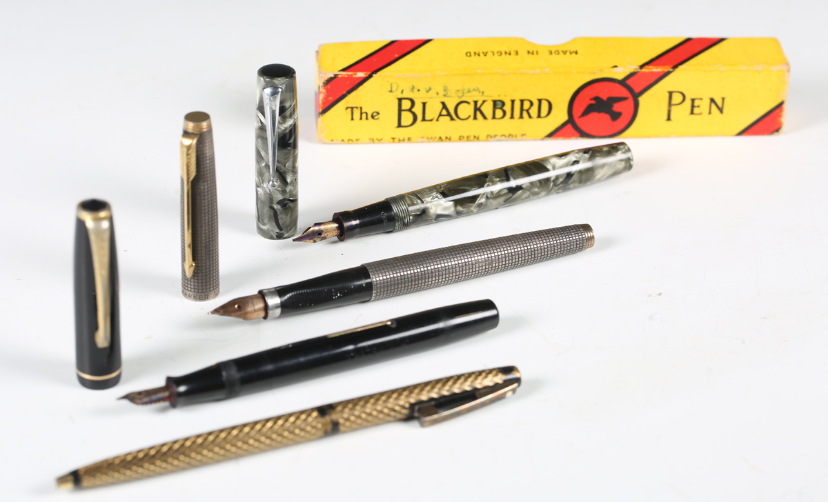 A Parker sterling silver cased fountain pen, a Blackbird self-filling fountain pen, boxed, a Boots fountain pen and a Sheaffer ballpoint pen.