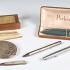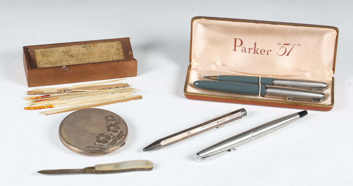 A Parker 51 fountain pen and matching pencil, cased, another Parker fountain pen, a colour changing ballpoint, a silver compact, a silver and mother-of-pearl fruit knife and a boxed set of Spellicans.