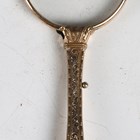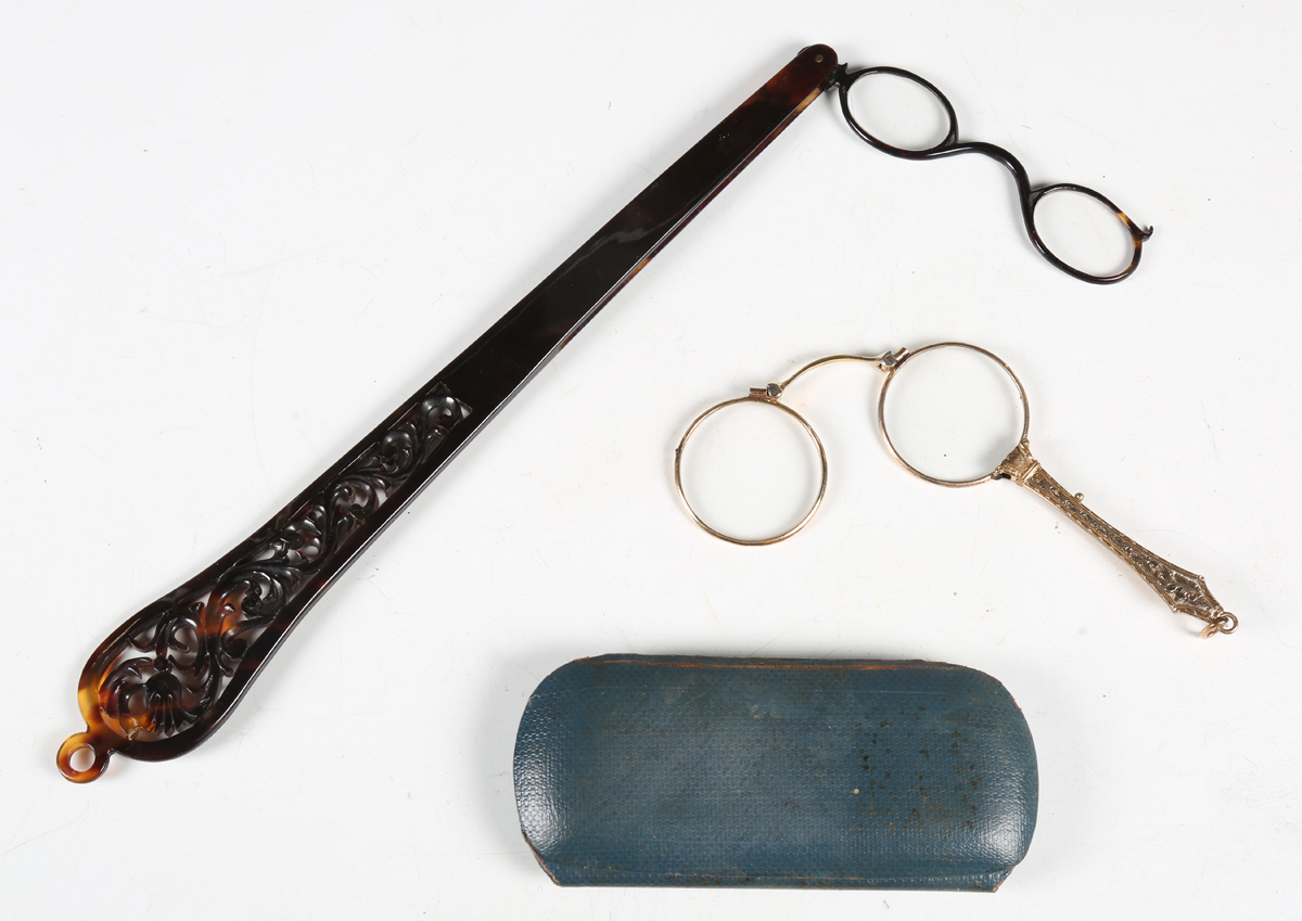 A Victorian tortoiseshell lorgnette with foliate pierced handle, length 28cm, together with a gilt metal and foliate engraved lorgnette.