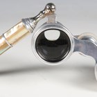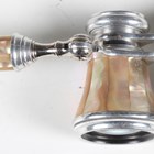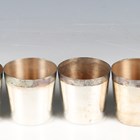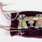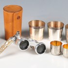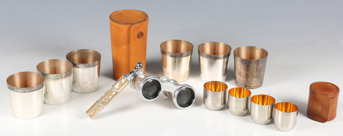 A pair of early 20th century mother-of-pearl mounted opera glasses with telescopic handle, together with two leather cased sets of silver plated interfitting beakers.