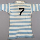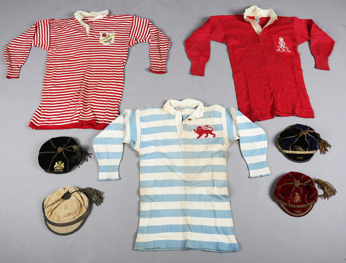 A group of three early 20th century match-worn rugby shirts and four related caps, all worn by F.W. Simpson, a military officer and rugby player, including a Cambridge University shirt, an Army Rugby Union shirt and a Lancashire shirt.
