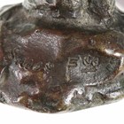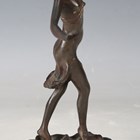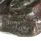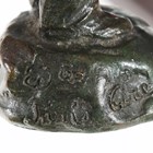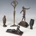 An early 20th century brown patinated cast bronze figure of a man wearing an overcoat, the base detailed 'Jager Susse Freres... Paris', height 14cm, together with four other bronze figures.