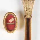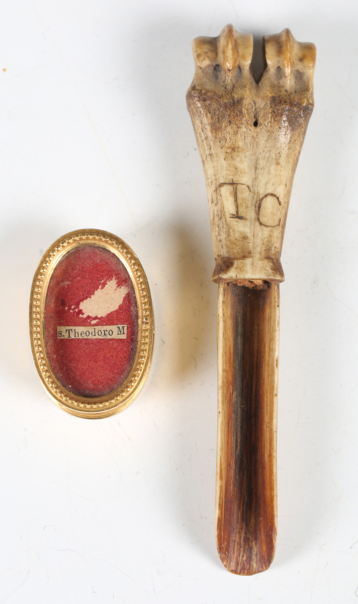 An 18th century carved bone apple corer, possibly prisoner-of-war made, length 12cm, together with a 19th century gilt metal oval patch box.