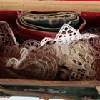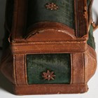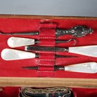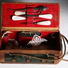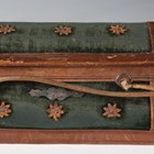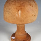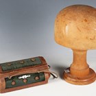A 19th century green velvet and leather trimmed needlework casket, the interior fitted with a selection of accoutrements, width 20cm, together with a milliner's hat former.