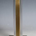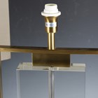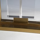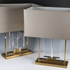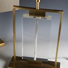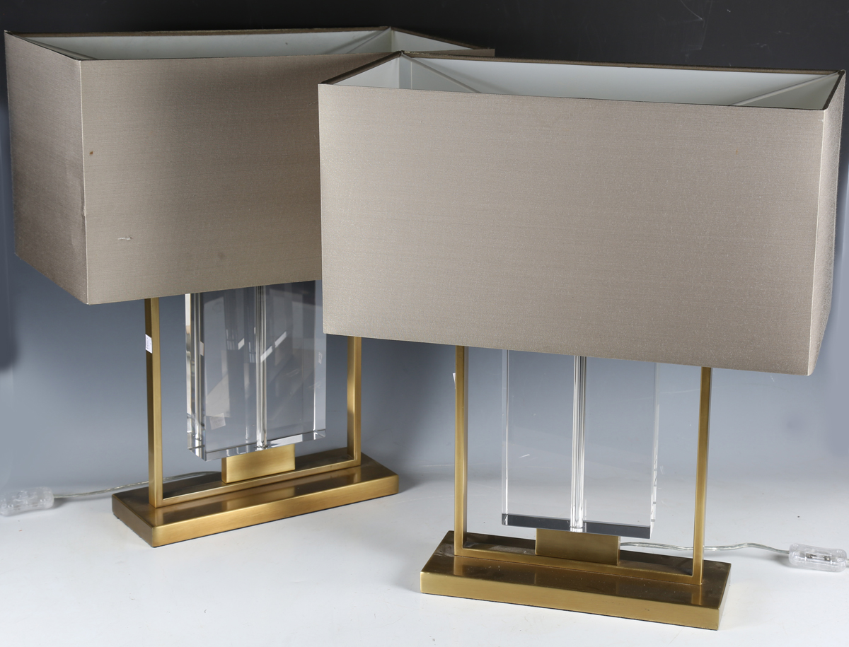 A pair of modern gilt brass and glass table lamps with angular shades, height 55cm, width 48cm.