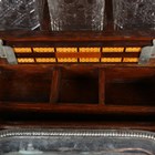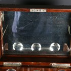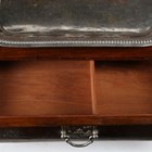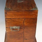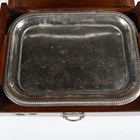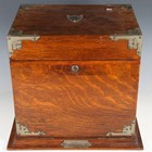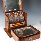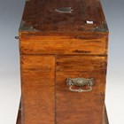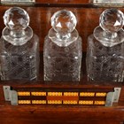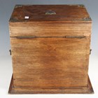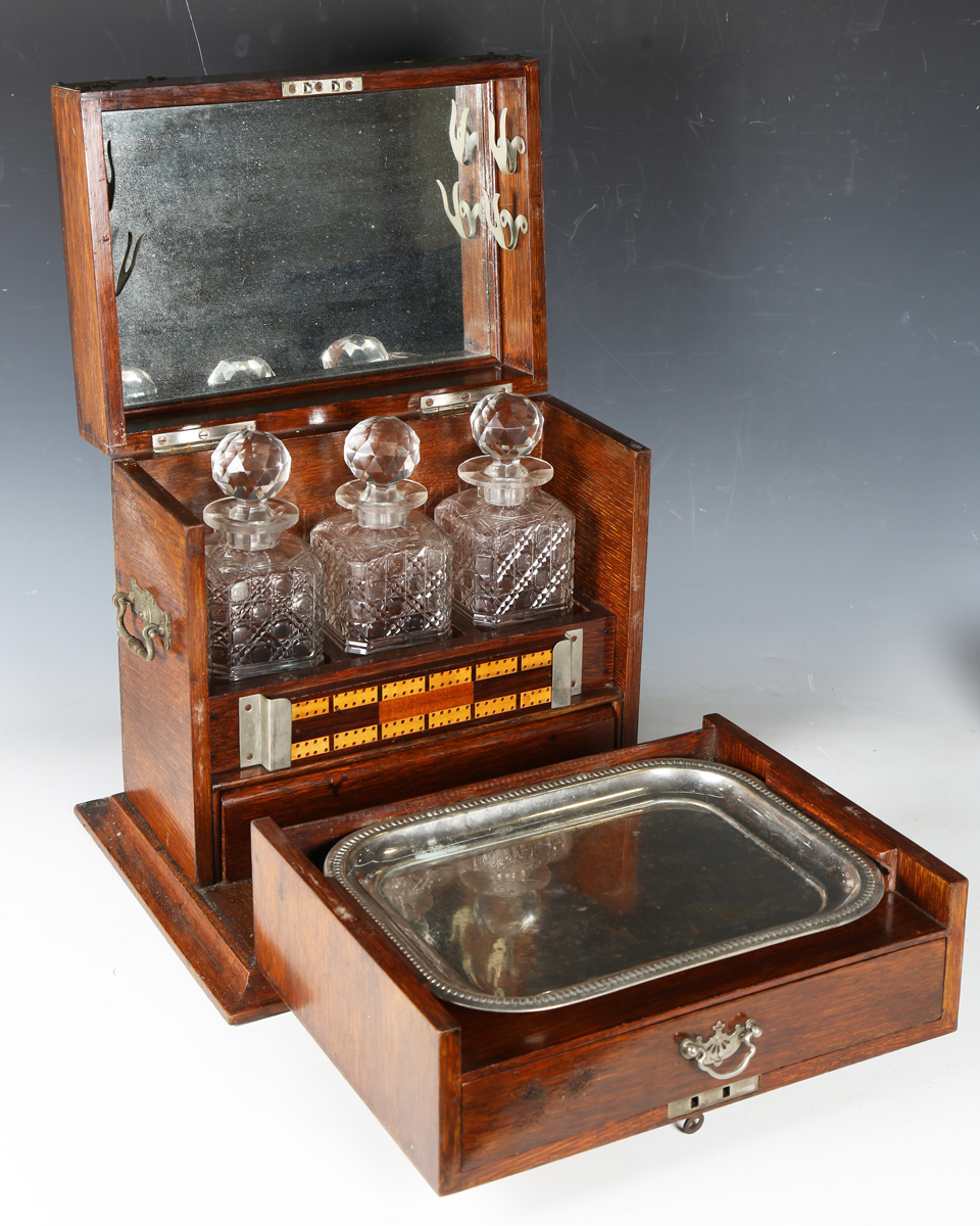 An early 20th century oak and nickel mounted tantalus, the hinged lid and fall front enclosing three glass decanters (faults), a plated drinks tray and a cribbage board, width 40cm.