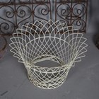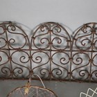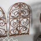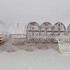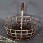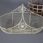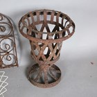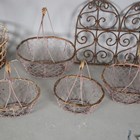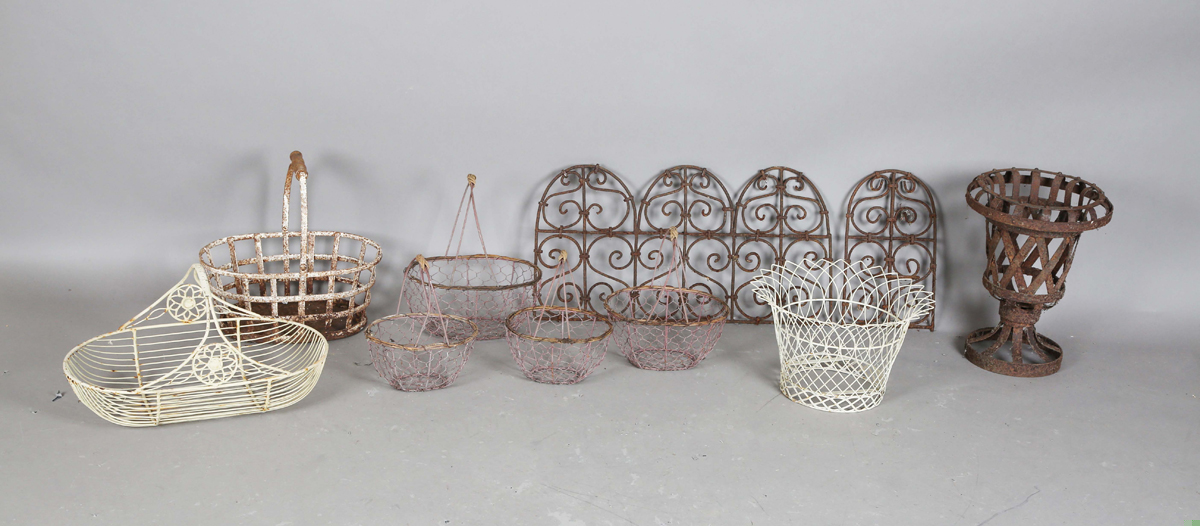 A group of seven wirework baskets, a wrought iron garden urn and a wirework arched panel.