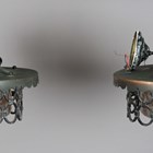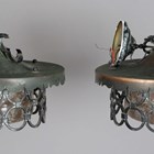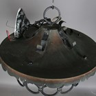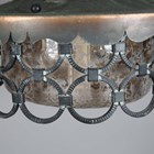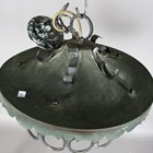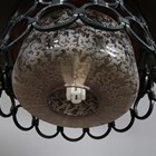 A pair of mid-20th century anodized copper circular ceiling lights with crackle frosted glass shades and circular lattice sides, height 29cm, diameter 45cm.