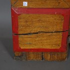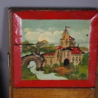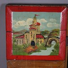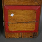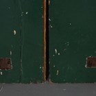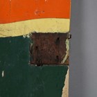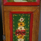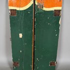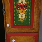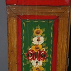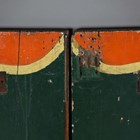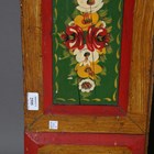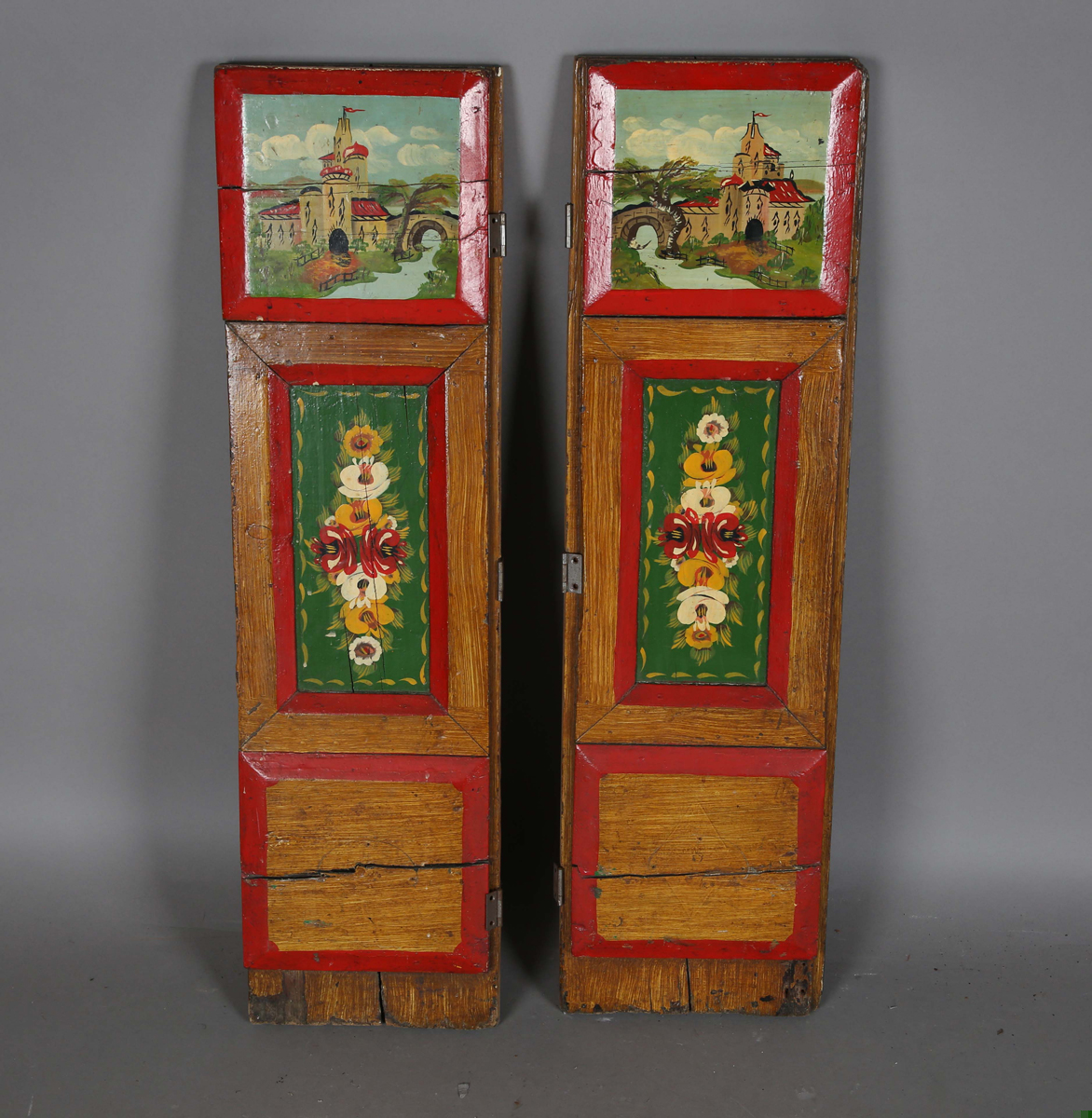 A pair of late 19th century barge doors, painted with landscape and floral panels within oak scumbled borders, each door 93cm x 25cm.