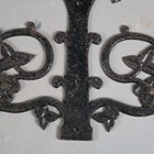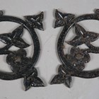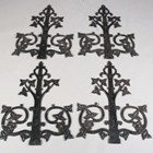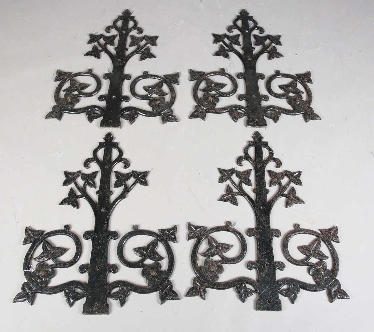 A set of four early 20th century wrought iron ornamental mounts of foliate strapwork form, stamped 'A. Kennick & Sons No 27' to reverse, 70cm x 55cm.
