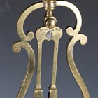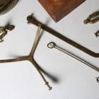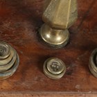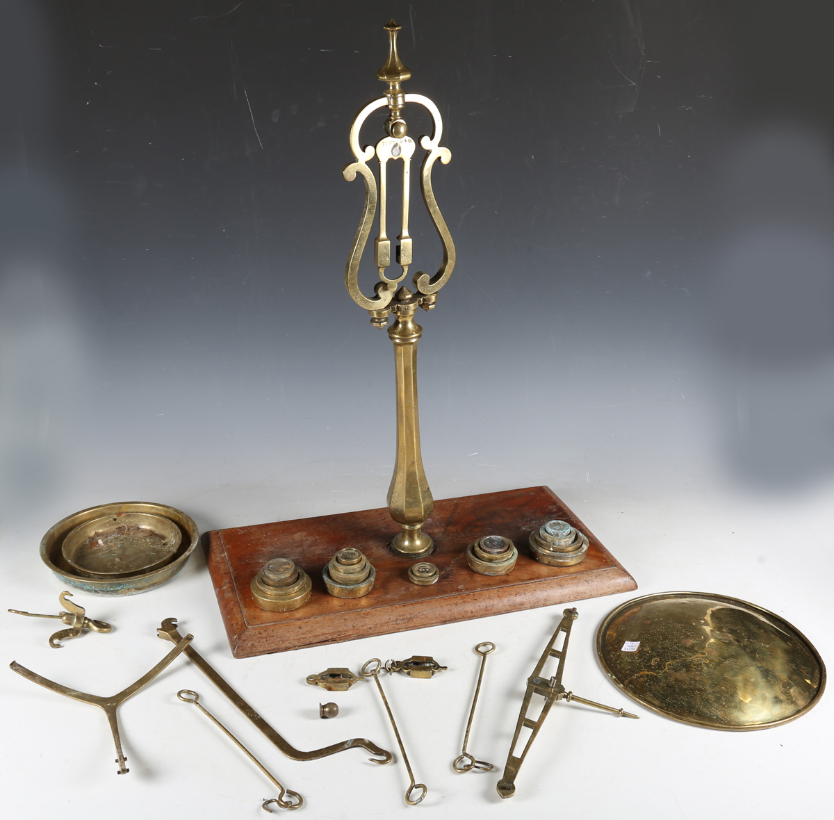 A late Victorian set of brass balance scales by W. & T. Avery, raised on a wooden plinth (dismantled).