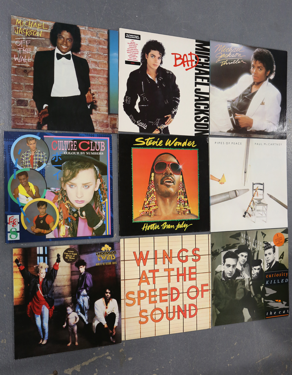 A collection of approximately forty-six LP records, mostly 1980s, including albums by Depeche Mode, Michael Jackson, Sade, Queen and Duran Duran.