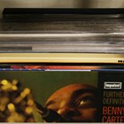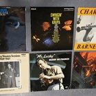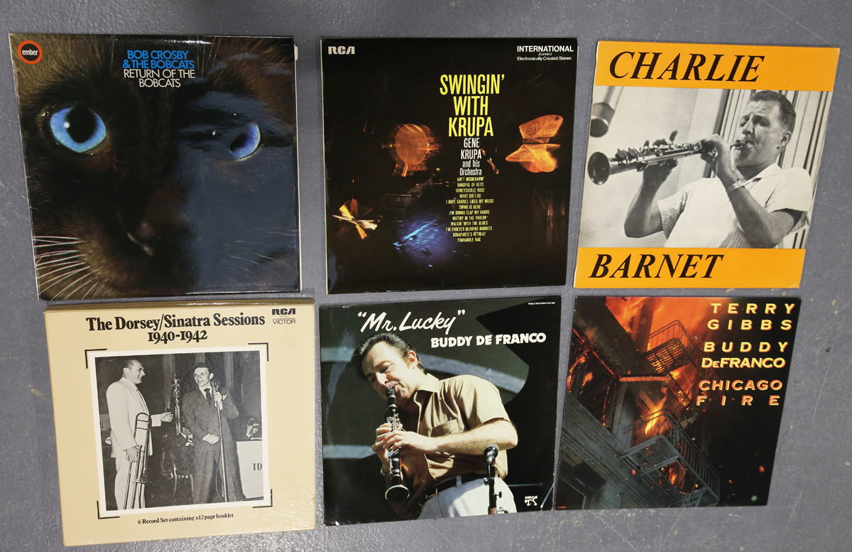 A collection of approximately forty-six jazz LP records, including signed copies of 'Further Definitions' by Benny Carter, and 'Holiday For Saving' by Buddy DeFianco and Terry Gibbs, and albums by Gene Krupa, Tommy Dorsey, Charlie Barnet, Harry James, Bunny Berigan, Bob Crosby, Jo Jones and Vic Dickenson.