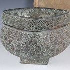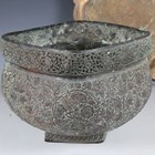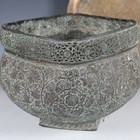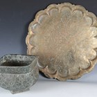 A late 19th century Indian copper jardinière, finely chased and pierced with foliage, width 27cm, together with an Eastern brass tray.