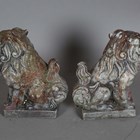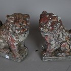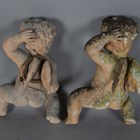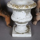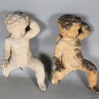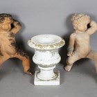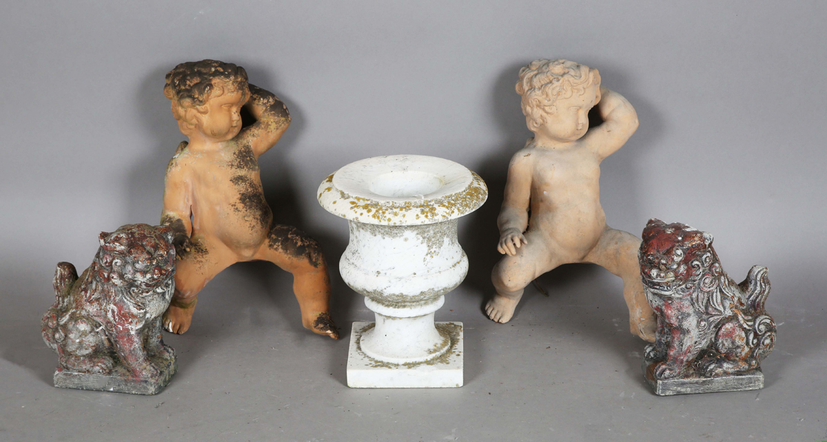 A 20th century white marble garden urn, height 30cm, together with a pair of moulded terracotta garden models of cherubs, height 43cm, and a pair of cast stone garden models of Buddhistic lions, height 26cm.