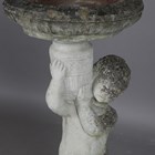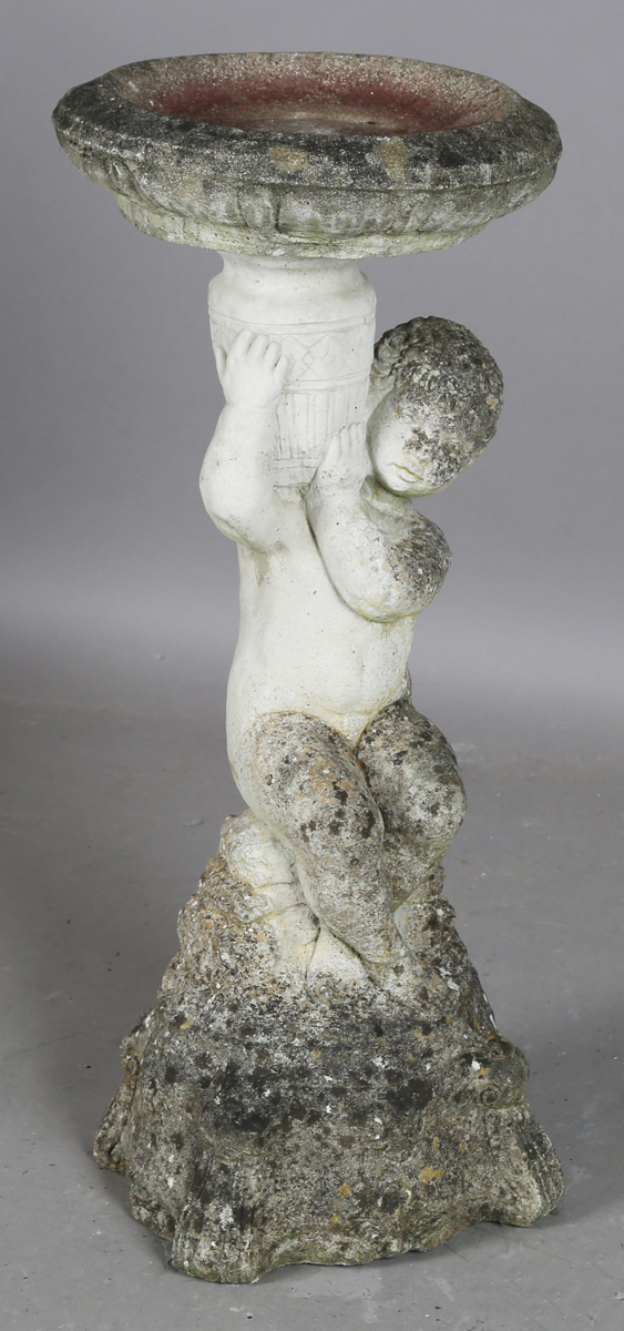 A late 20th century composition stone birdbath with figural putto support, height 76cm.