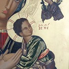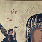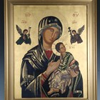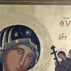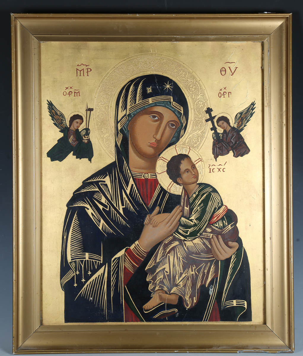 A 20th century Greek painted and gilded icon panel depicting 'Our Lady of Perpetual Help', 53cm x 41cm, framed.