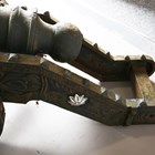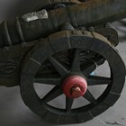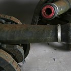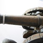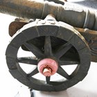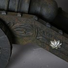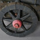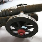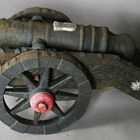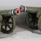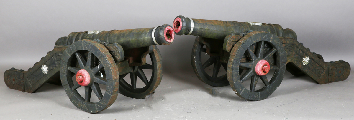 A pair of large 20th century cast iron ornamental field cannons with wheeled carriages, length 147cm.