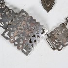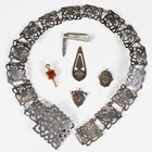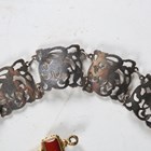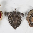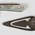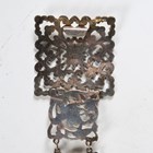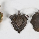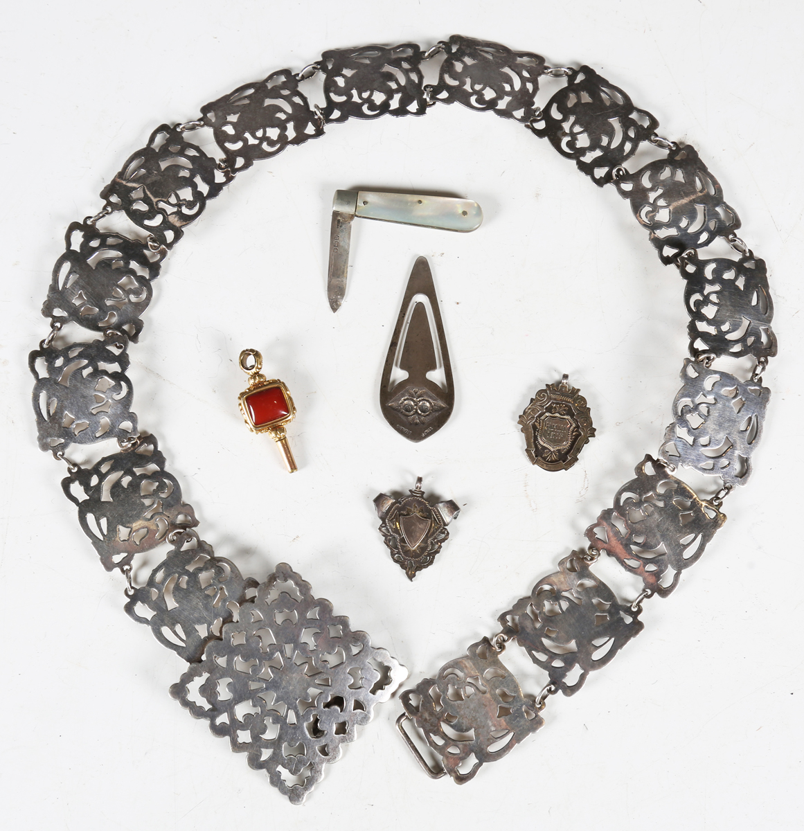 A group of collectors' items, comprising a Victorian gilt metal mounted, varicoloured agate watch key, a silver bladed mother-of-pearl folding fruit knife, Sheffield 1914, two silver fob medals, a sterling book marker, a plated lady's waistbelt and a Victorian ring box.