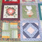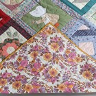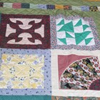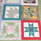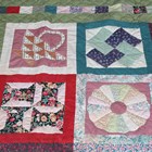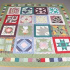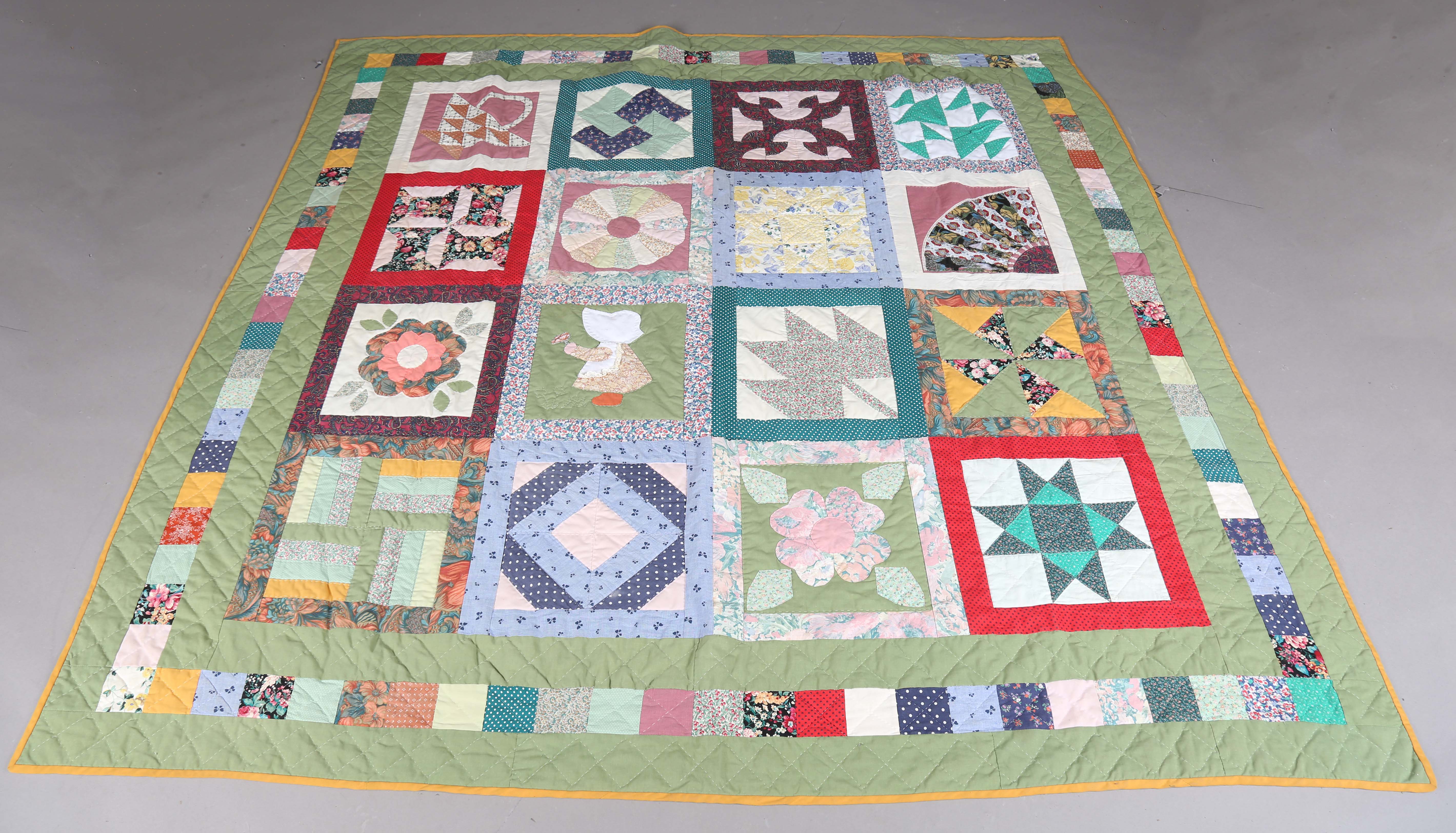 A 20th century patchwork cotton quilt, worked with overall compartments enclosing stylized forms, 207cm x 207cm.