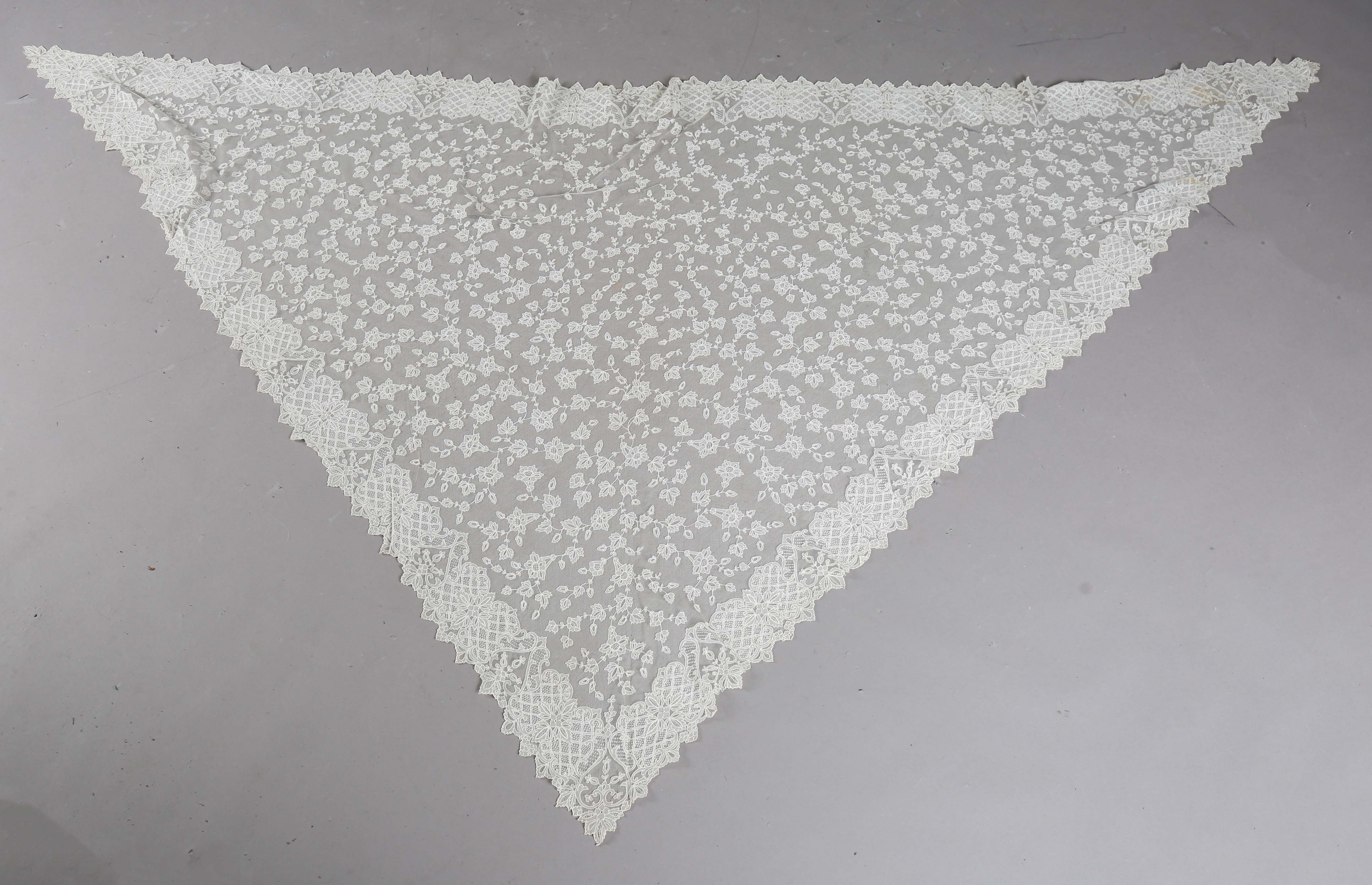 A late 19th century lace bridal veil with overall floral vine within a scalloped border, width 267cm.