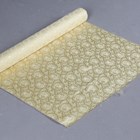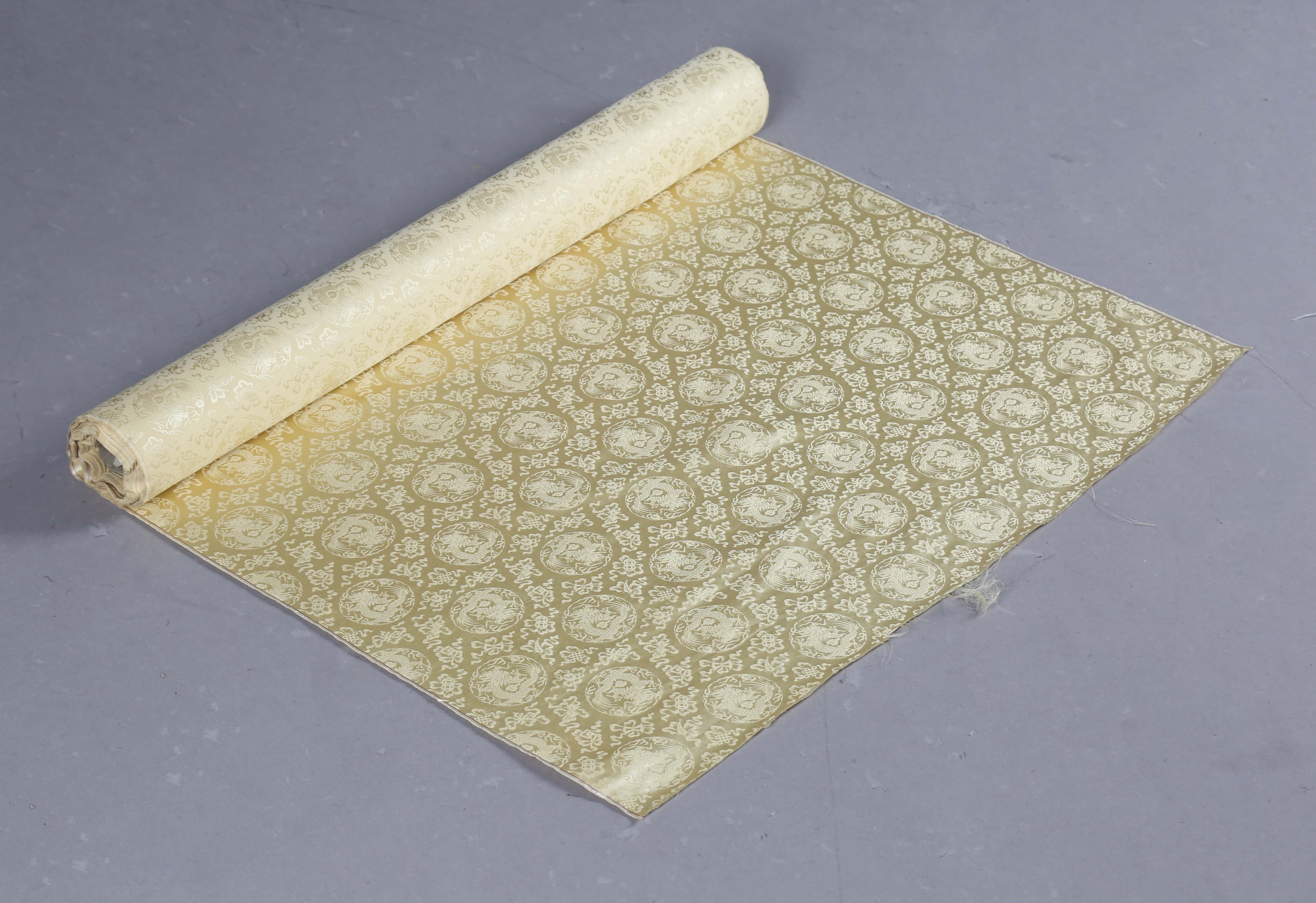 A bolt of Chinese yellow machined silk with an overall repeating pattern of circular dragon motifs, width 78cm.