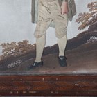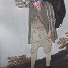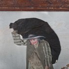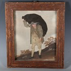 A 19th century folk art appliqué fabric and watercolour panel depicting a gentleman carrying a large bag, in the manner of George Smart, within a straw work frame, 33.5cm x 29cm.