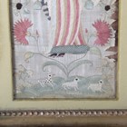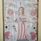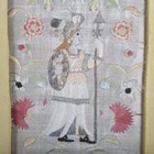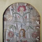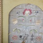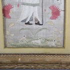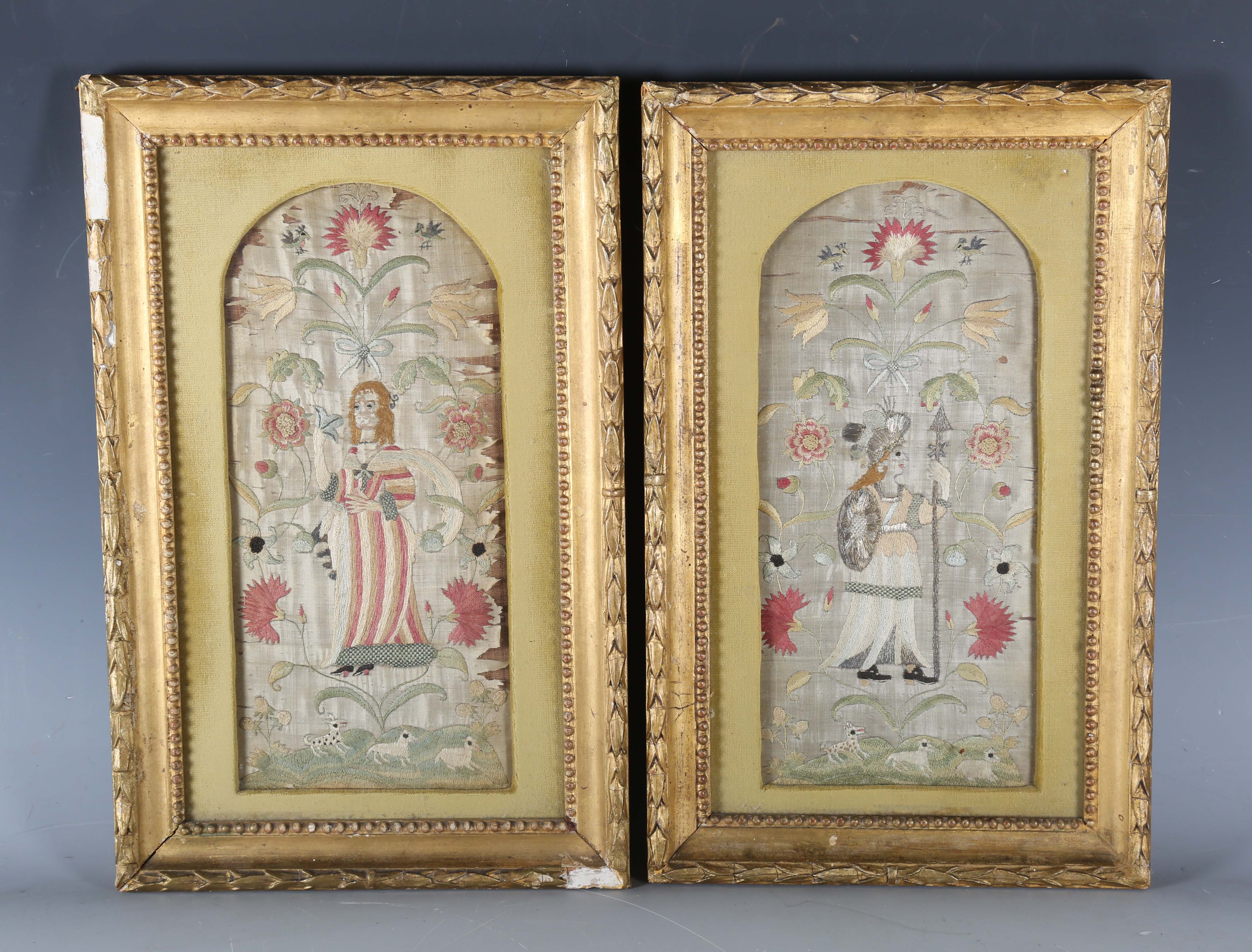A pair of late 17th/early 18th century silkwork panels, each worked in coloured silks and one with metal thread with a figure surrounded by flowering stems above a hillock with dog and sheep, 28.5cm x 13cm, within 19th century gilt composition frames.