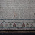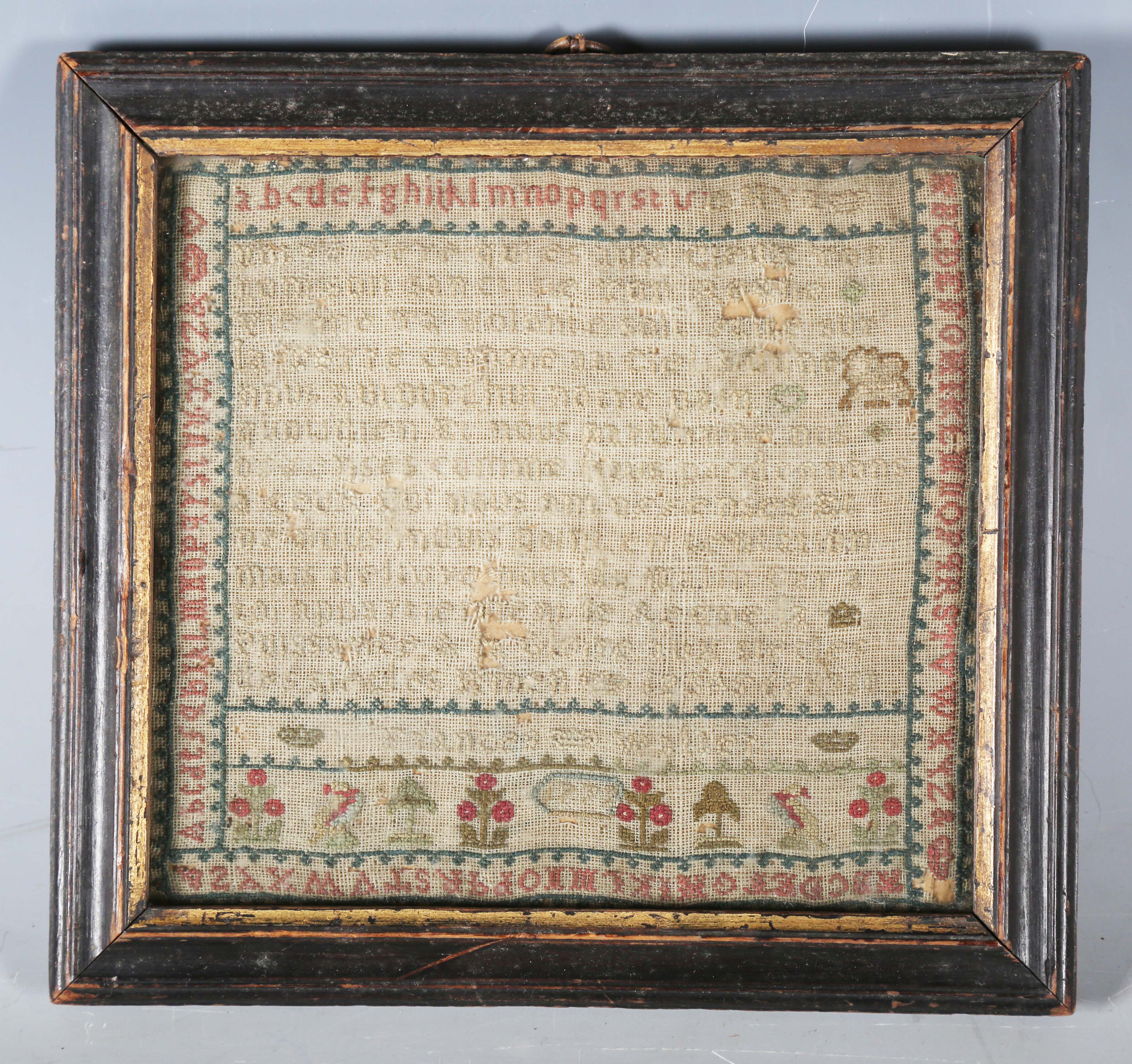 A small George III needlework sampler by Frances Waller, indistinctly dated 1772, 14cm x 15cm, within a period frame.
