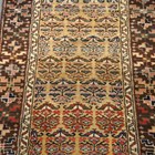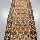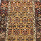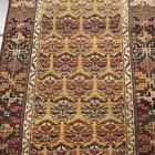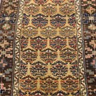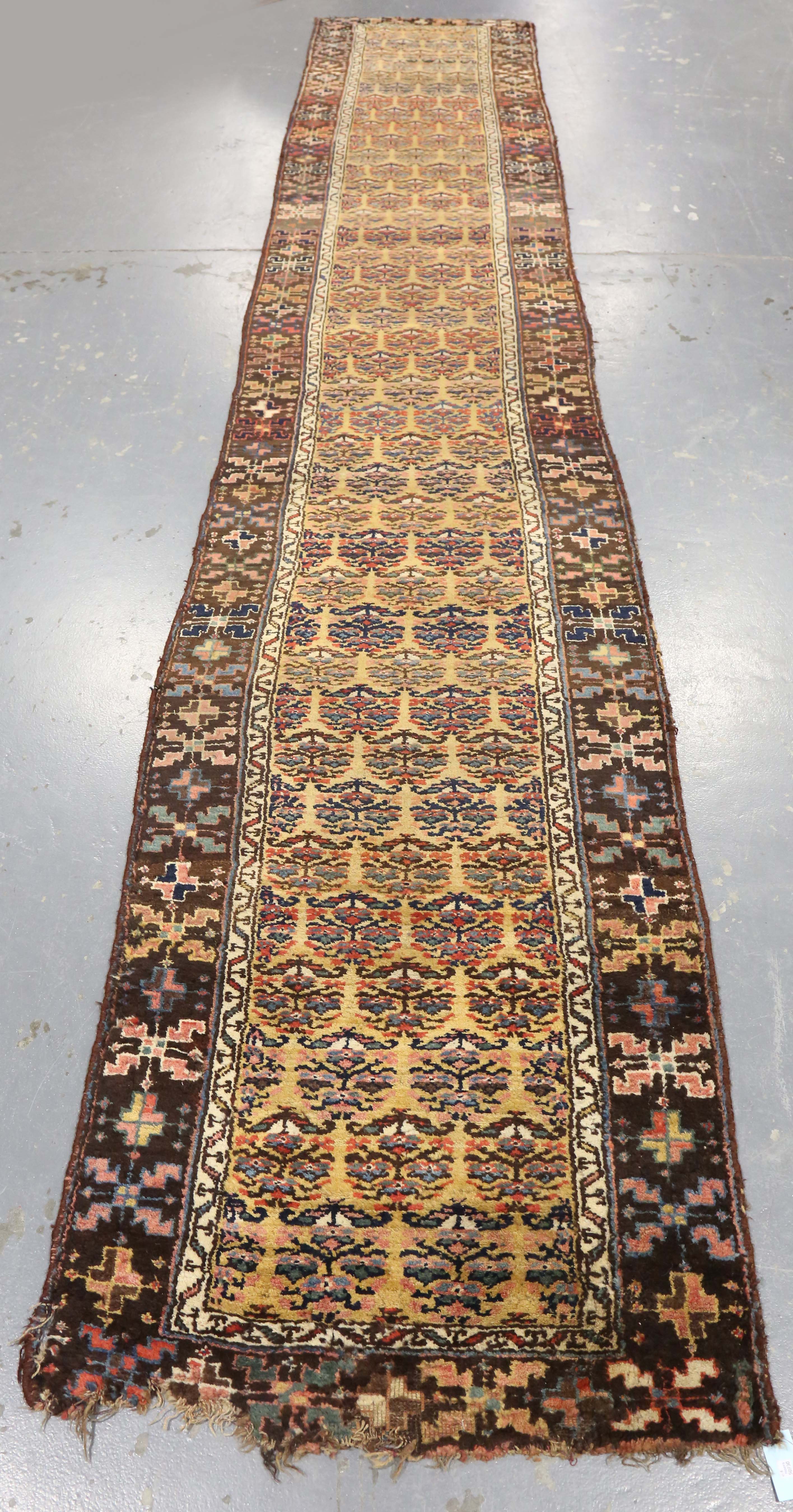 A Garabagh runner, South-east Caucasus, early 20th century, the mustard yellow field with overall offset floral sprays, within a brown border, 510cm x 91cm (faults).