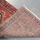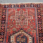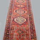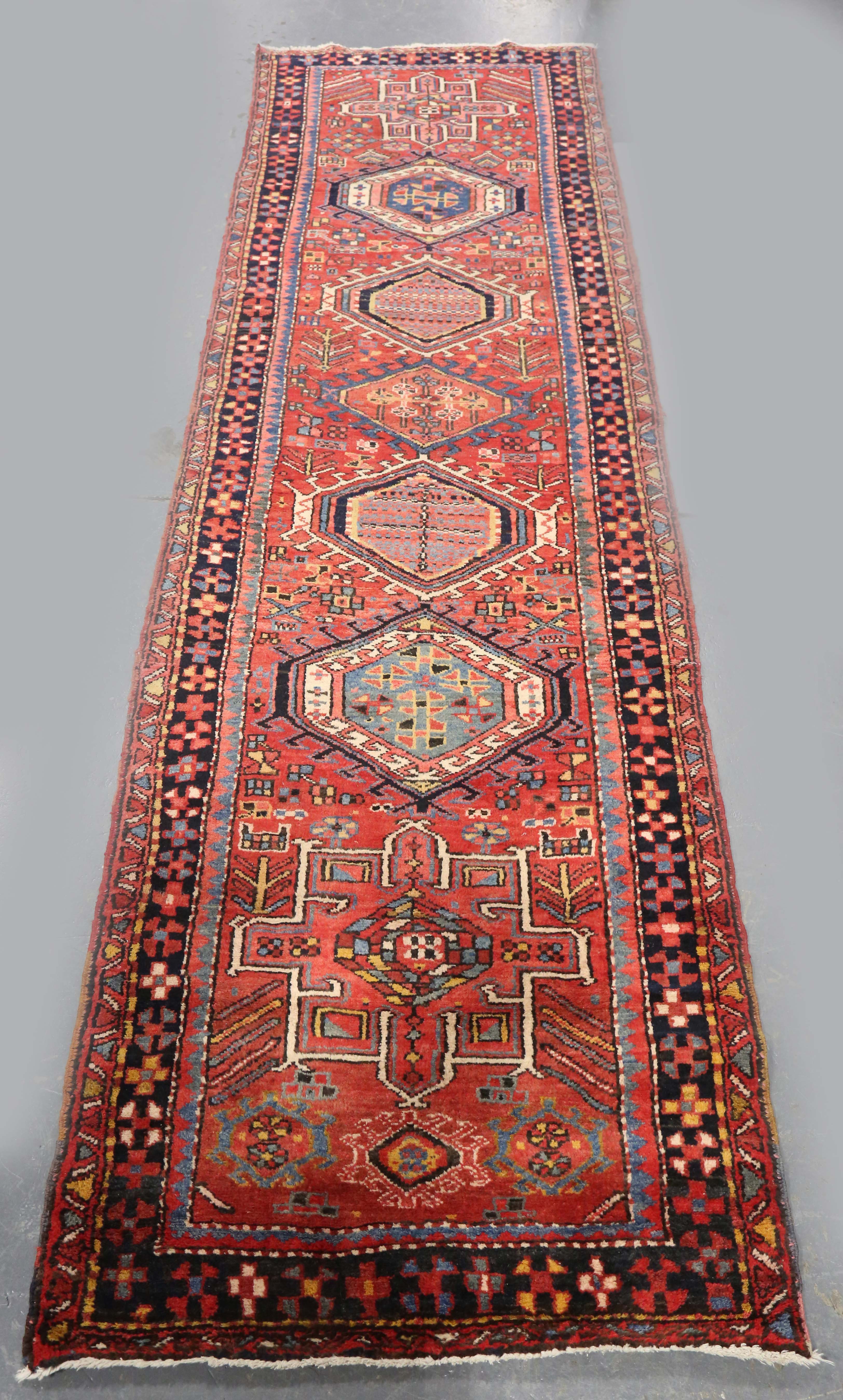 A Heriz runner, North-west Persia, mid-20th century, the red field with a column of medallions, within a dark blue stylized flowerhead border, 320cm x 93cm.