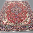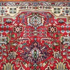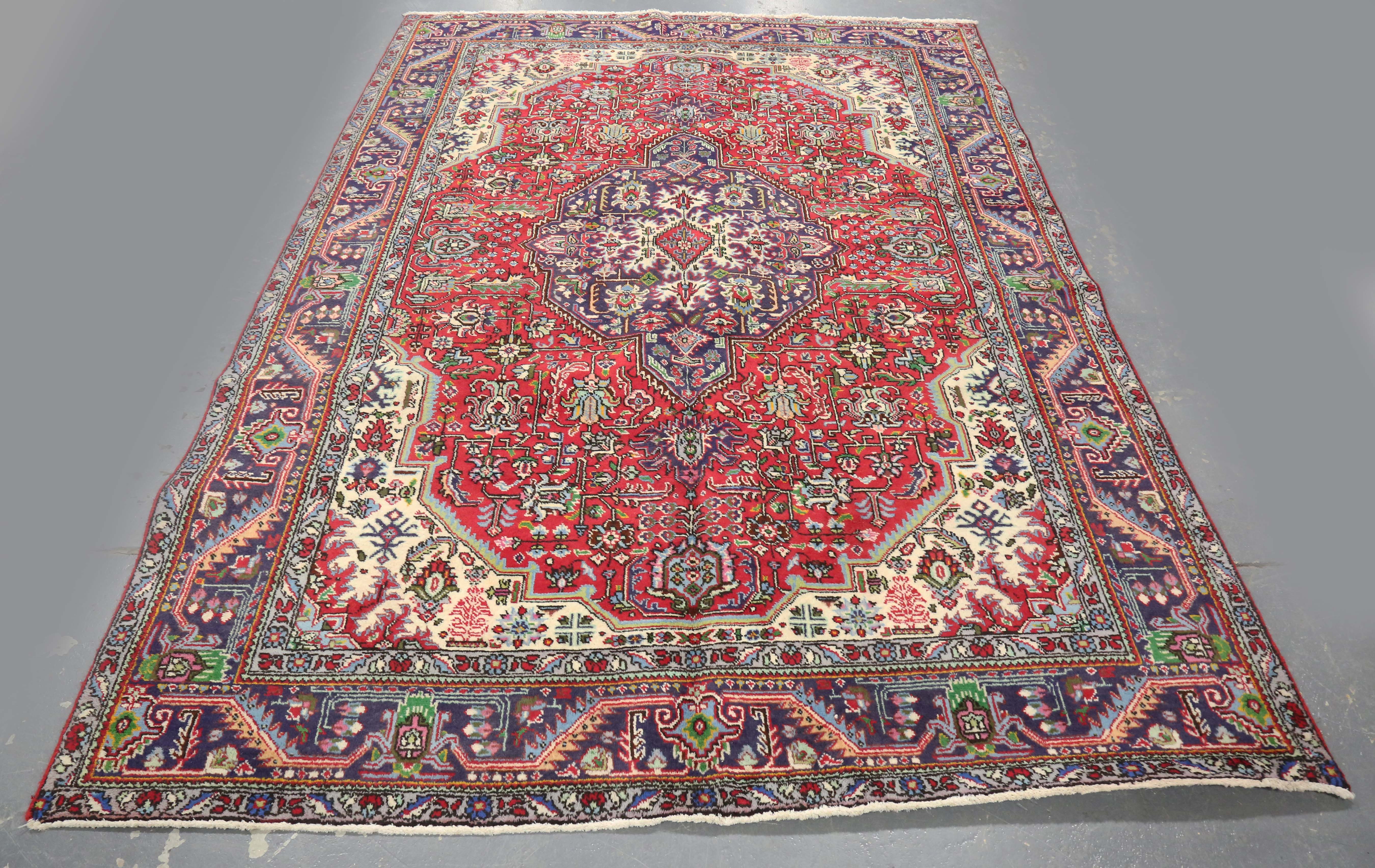 A Tabriz carpet, North-west Persia, mid-20th century, the red field with an angular medallion, within a palmette and serrated leaf border, 300cm x 207cm.