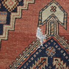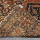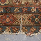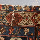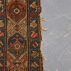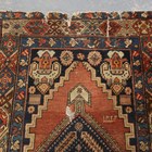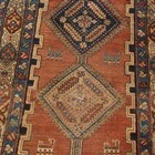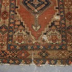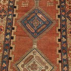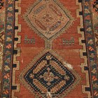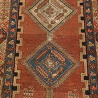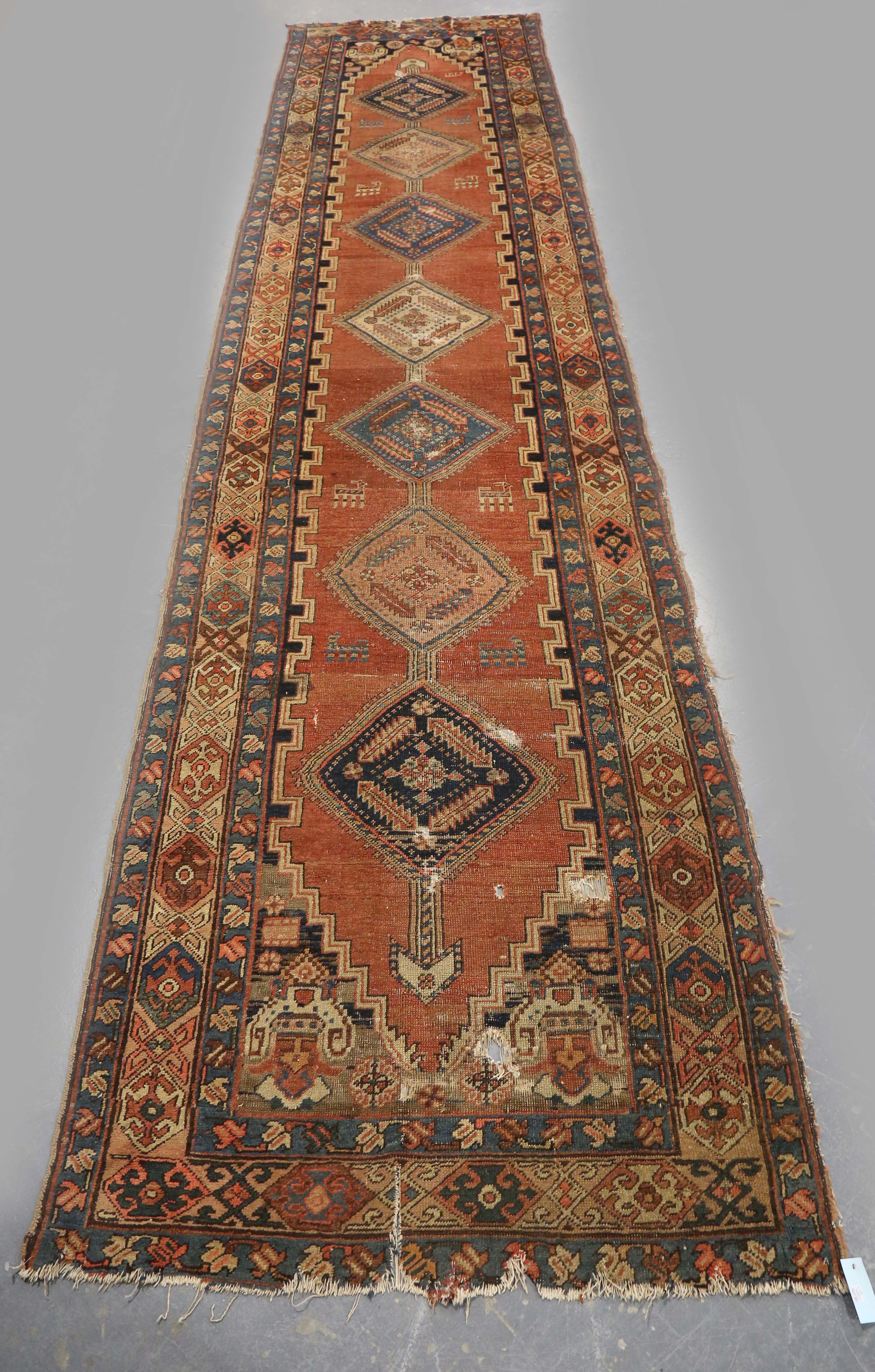 A Kurdish runner, circa 1911, the terracotta field with a column of linked medallions supported by stylized animals and bearing date for the Islamic year of 1329 (1911), within a continuous palmette border, 432cm x 105cm (faults).