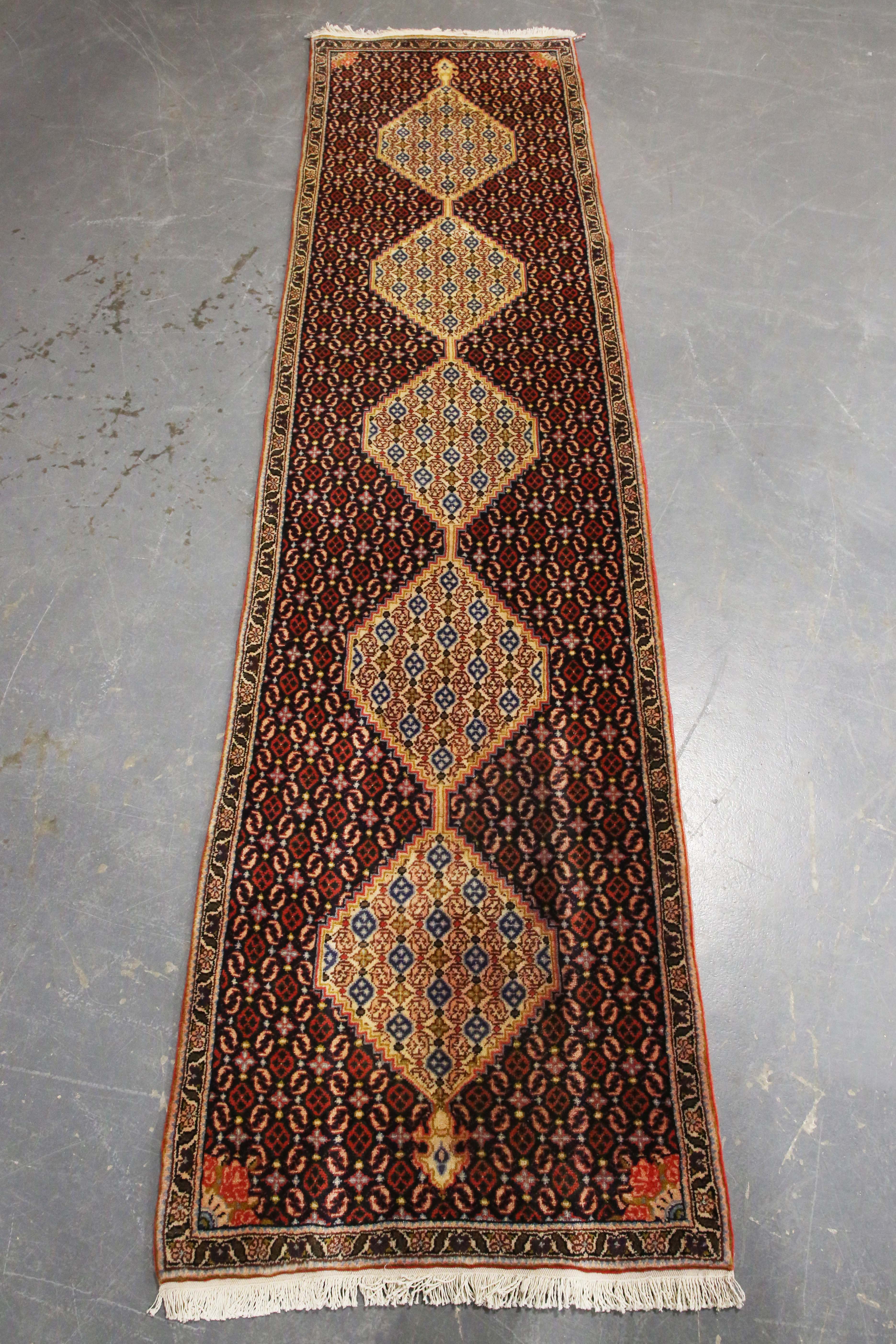 A Senneh runner, South Persia, late 20th century, the charcoal field with five linked medallions supported by herati, within a thin foliate border, 282cm x 70cm.