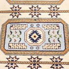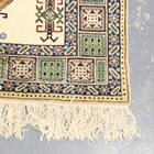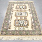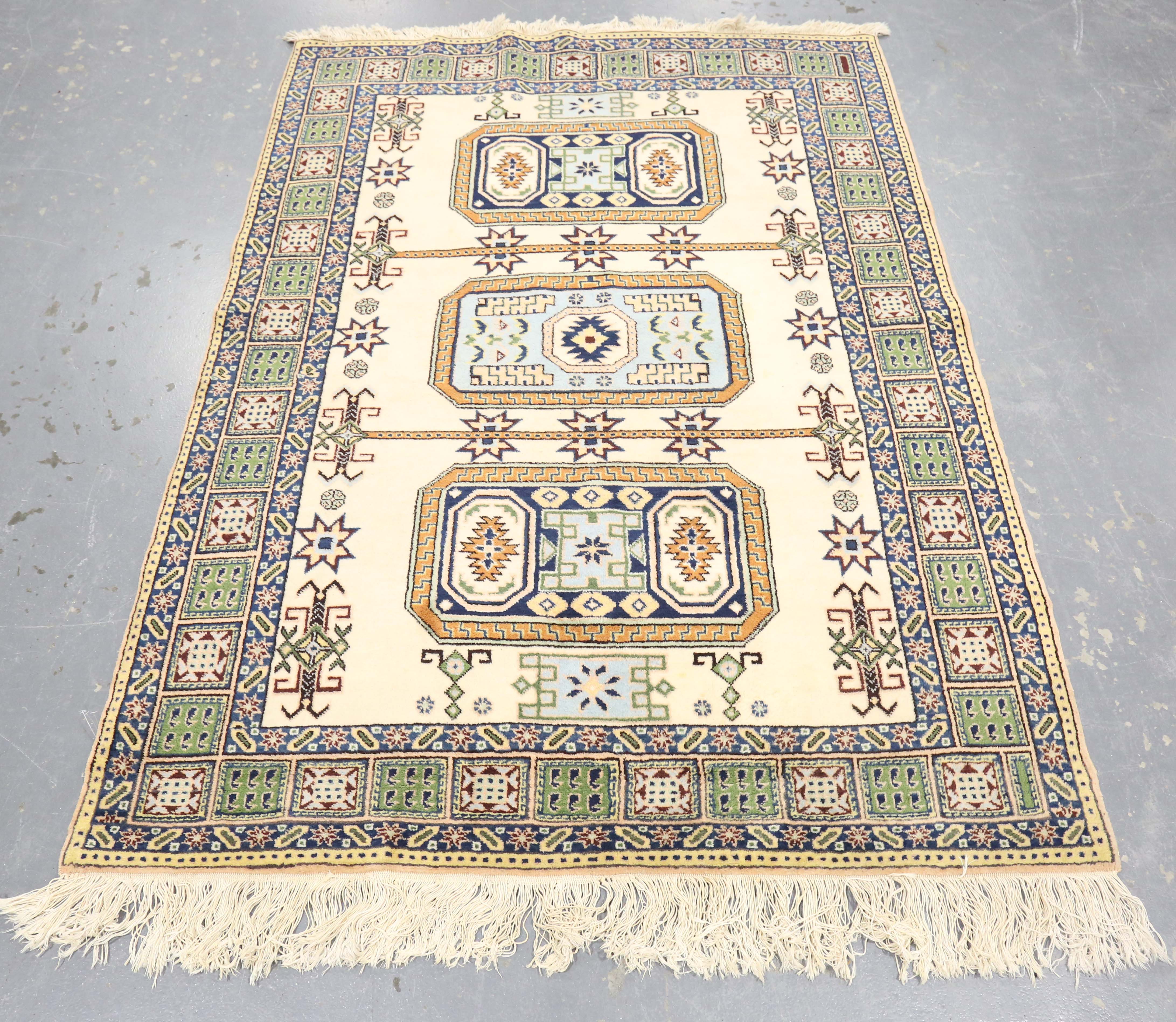 A Turkish rug, mid-20th century, the ivory field with three rectangular medallions, within a compartmentalized border, 190cm x 137cm.
