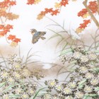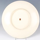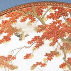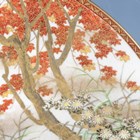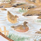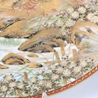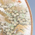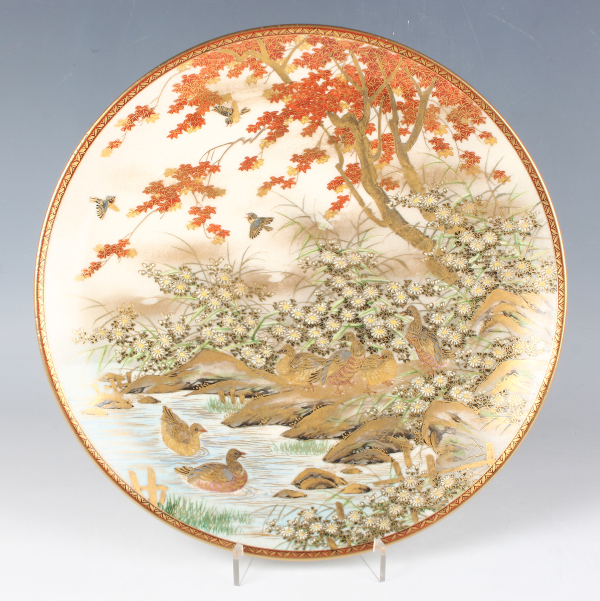 A Japanese Satsuma earthenware circular plate, Meiji period, painted and gilt with ducks swimming and on rocks beneath flowers, sparrows and an acer, gilt and iron red signature seal to base, diameter 25.1cm.