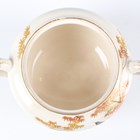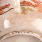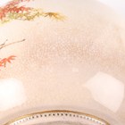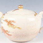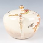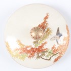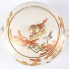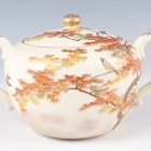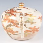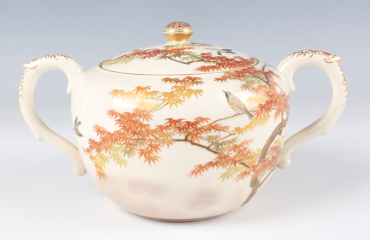 A Japanese Satsuma earthenware two-handled sugar bowl and cover by Yabu Meizan, Meiji period, the squat circular body and cover finely painted and gilt with sparrows flying and perched amidst acer branches, beneath a knop finial, gilt signature seal to base, height 9.4cm.