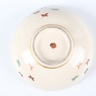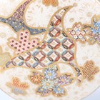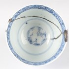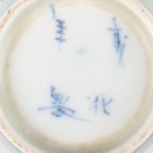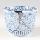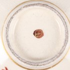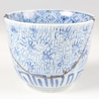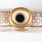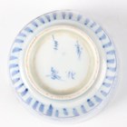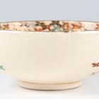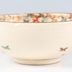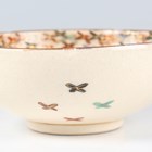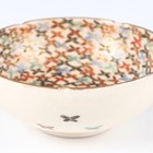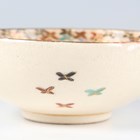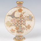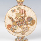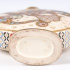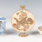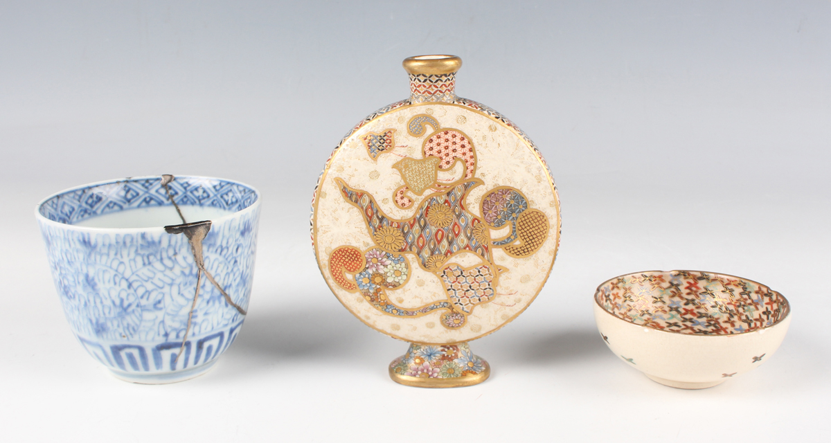 A Japanese Satsuma earthenware moonflask, Meiji period, the flattened circular body painted and gilt with variously shaped brocade filled panels on a flower ground, unsigned, height 10.2cm, together with a small Satsuma earthenware bowl, painted and gilt with a design of butterflies, diameter 6.2cm, and a Japanese blue and white porcelain teabowl, Edo period, height 5.6cm (repaired).