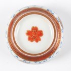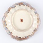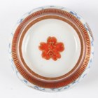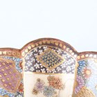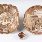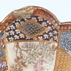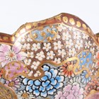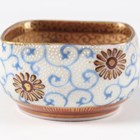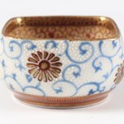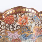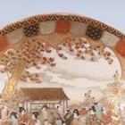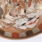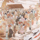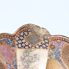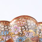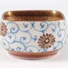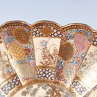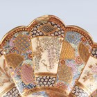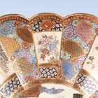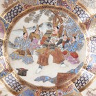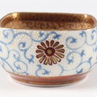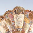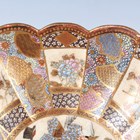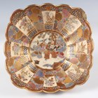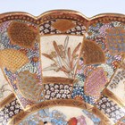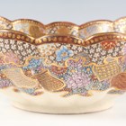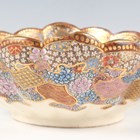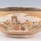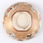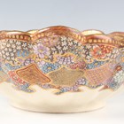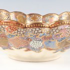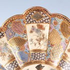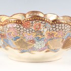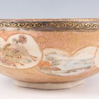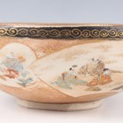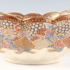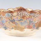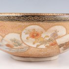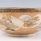 A Japanese Satsuma earthenware circular bowl, Meiji period, the interior painted and gilt with a gathering of figures in a water garden with koi carp beneath an overhanging acer, within simulated brocade borders, the exterior with variously shaped panels of figures, precious objects, flowers and landscapes, unsigned, diameter 13.1cm, height 4.9cm, together with another Satsuma earthenware bowl of fluted square outline, painted with samurai, flowers and simulated brocade, width 13.2cm, height 4.9cm (chip to rim), and a small Kutani porcelain bowl, width 3.2cm.