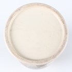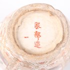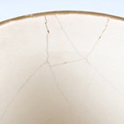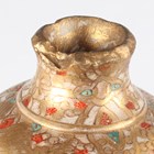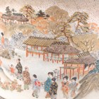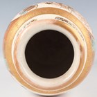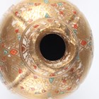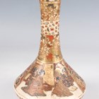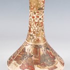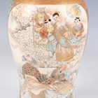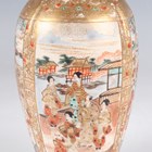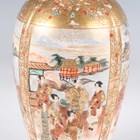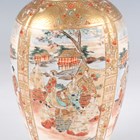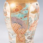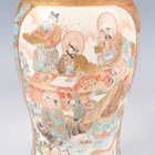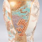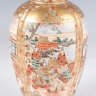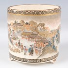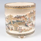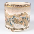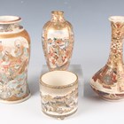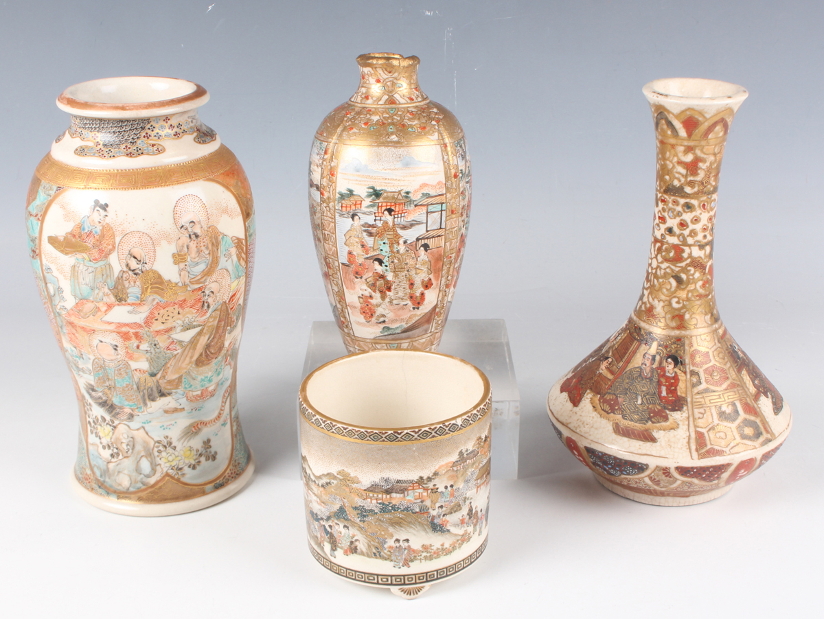 A Japanese Satsuma earthenware cylindrical pot, Meiji period, the exterior painted and gilt with a continuous landscape of figures, pavilions, trees and lake with Mount Fuji beyond, unsigned, height 7.6cm (repaired), together with three Satsuma earthenware vases, Meiji period, painted and gilt with figural panels, heights 14.6cm, 17.5cm and 18.1cm (the smallest with damaged neck).