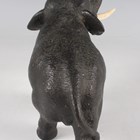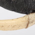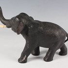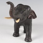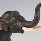 A Japanese brown patinated cast bronze figure of an elephant, Meiji/Taisho period, modelled standing with trunk raised, fitted with ivory tusks, incised signature to underside, height 12.8cm, length 18cm. Note: a non-transferrable ivory exemption certificate has been granted for the sale of this item.