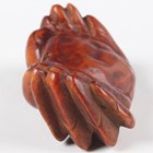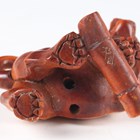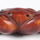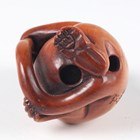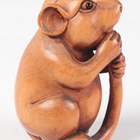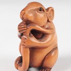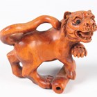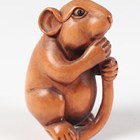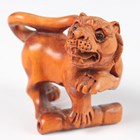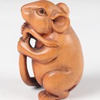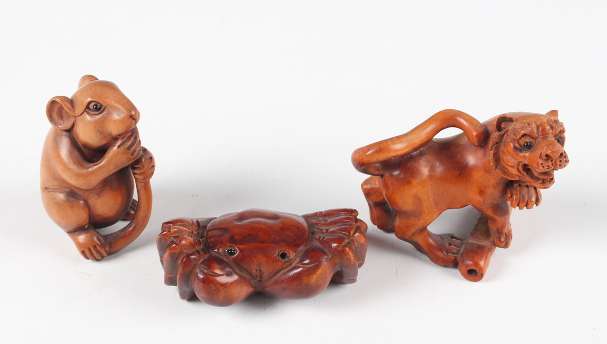 A group of three Japanese carved wood netsuke, 20th century, modelled as a crab, length 5.2cm, a rat, height 5cm, and a lion, length 5.4cm.