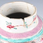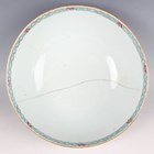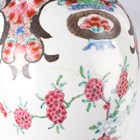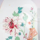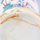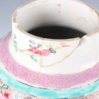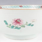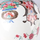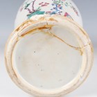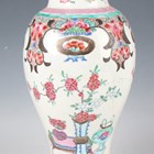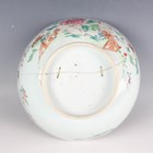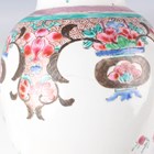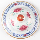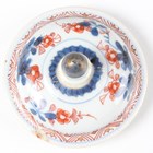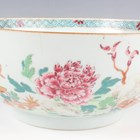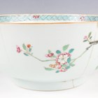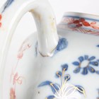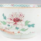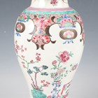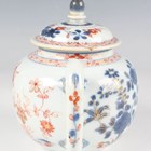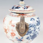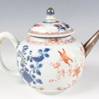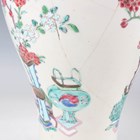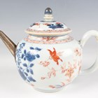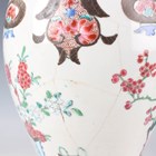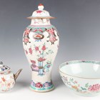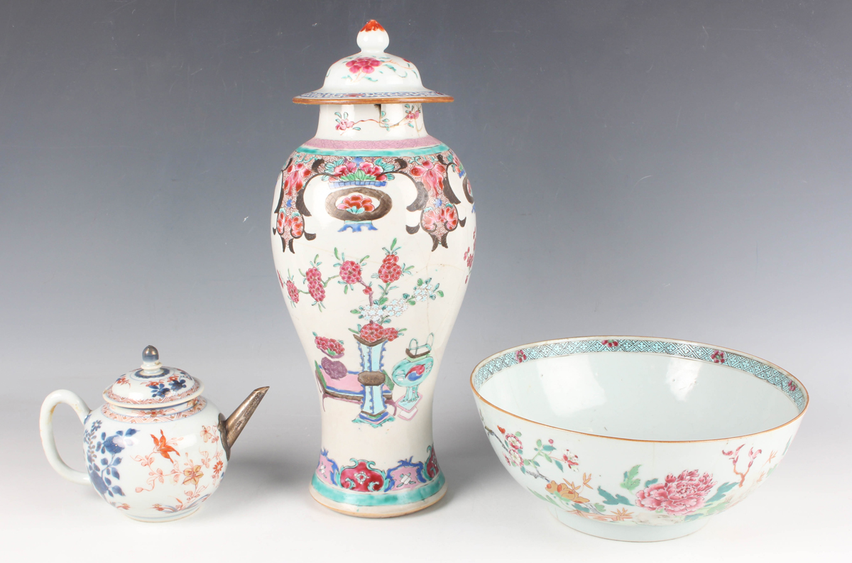 A Chinese famille rose export porcelain vase and cover, Qianlong period, the baluster body painted with precious vessels and blossoming branches, height 35cm, together with a Chinese famille rose export porcelain bowl, Qianlong period, painted with blossoming branches, diameter 23.6cm, and a Chinese Imari export porcelain teapot and cover, Kangxi period, painted with flowers, height 12.2cm (all with faults).