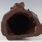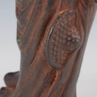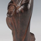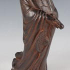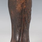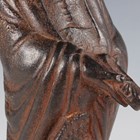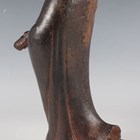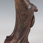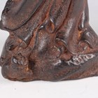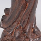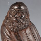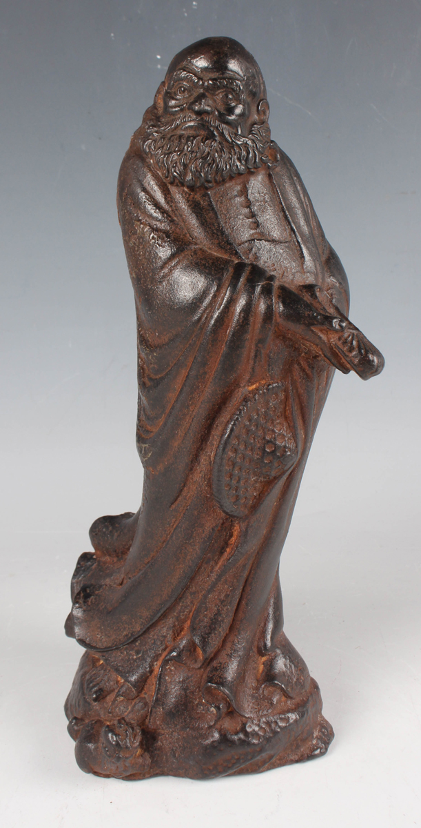 A Chinese cast iron figure of an immortal, modelled standing wearing a long robe, holding a hat and shoe in his hands, with a small Buddhistic lion cub at his feet, height 25cm.