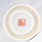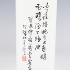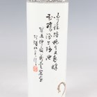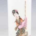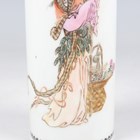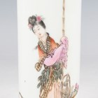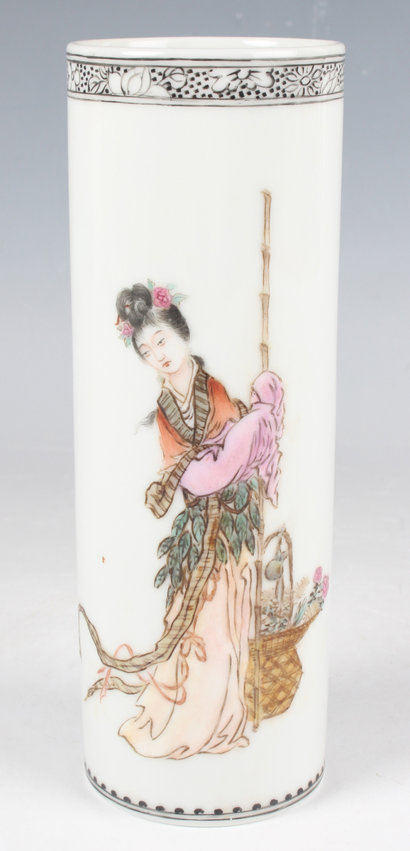 A Chinese famille rose porcelain brushpot, probably Republic period, of slender cylindrical form, painted with a standing maiden with flower basket, opposing four lines of black text and a red seal, within black borders, iron red painted seal mark to base, height 15.5cm.