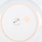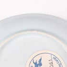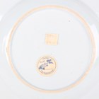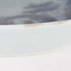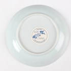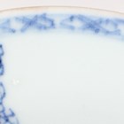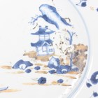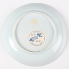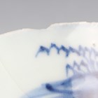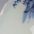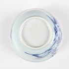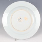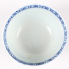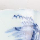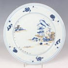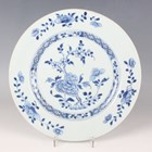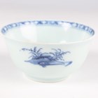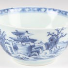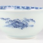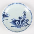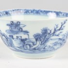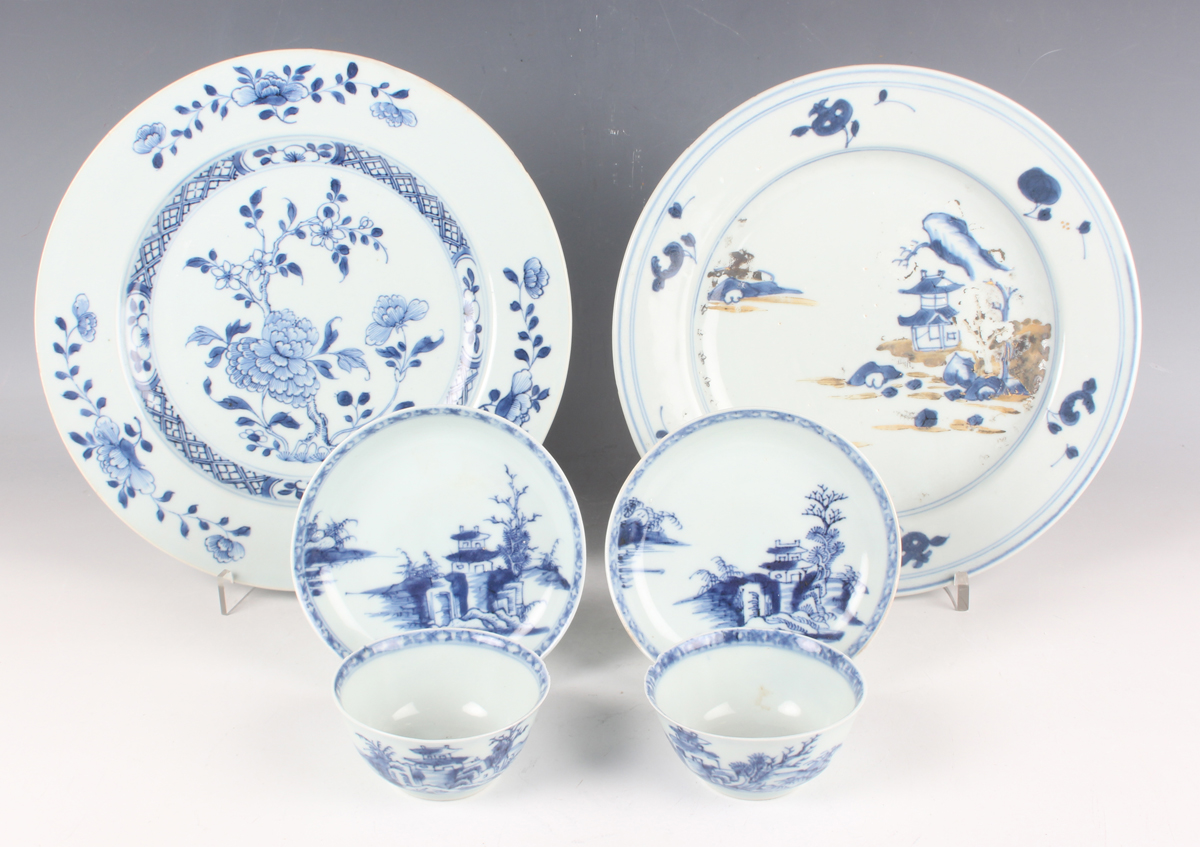 A small group of Chinese Nanking Cargo blue and white export porcelain, Qianlong period, comprising a pair of teabowls and saucers, painted with pagoda and river landscape, saucer diameters 11.5cm, and two plates, one painted with coastal landscape and six-flower border, diameters 23cm, the other with flowers, diameter 23.5cm, applied Nanking Cargo paper labels (one teabowl chipped and cracked).