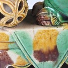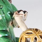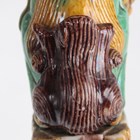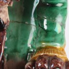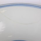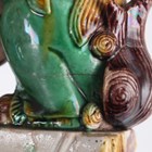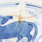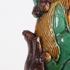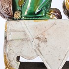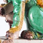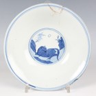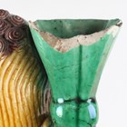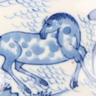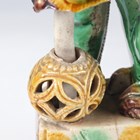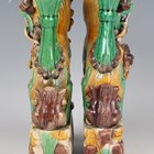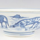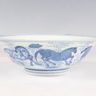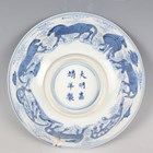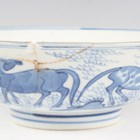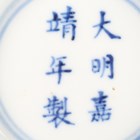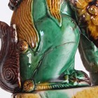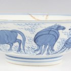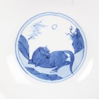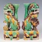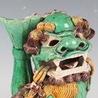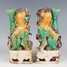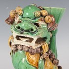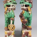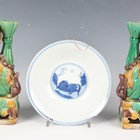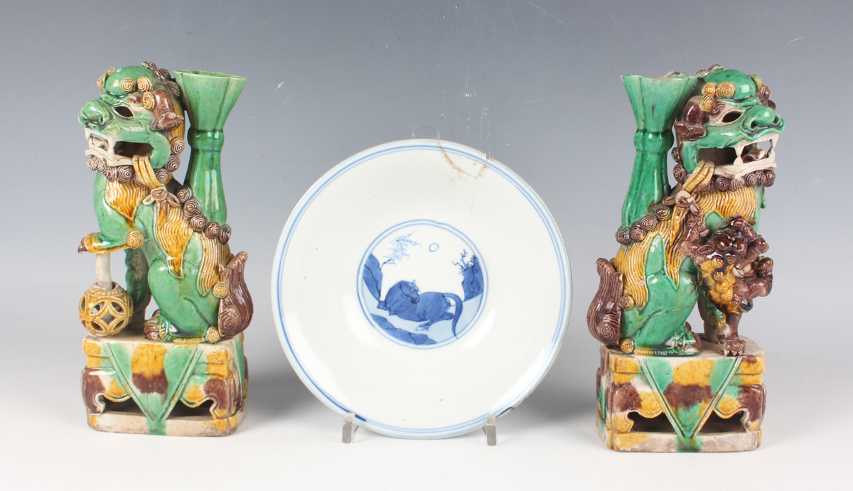 A pair of Chinese sancai enamelled biscuit porcelain Buddhistic lion jostick holder figures, Kangxi period, each modelled seated with a clambering cub or brocade ball at its feet, on a pierced rectangular plinth, height 19.6cm (some faults), together with a Chinese blue and white porcelain bowl, mark of Jiajing but later, painted with the eight horses of Muwang, underglaze blue six-character mark to base, height 5.1cm, diameter 16.2cm (chipped and repaired rim).