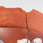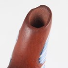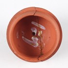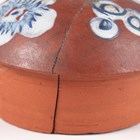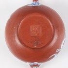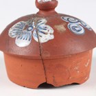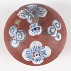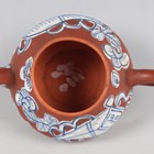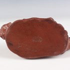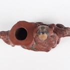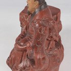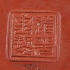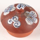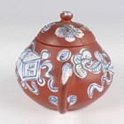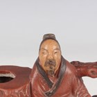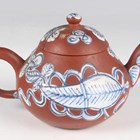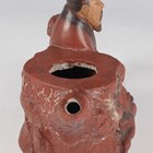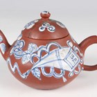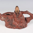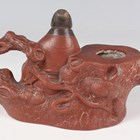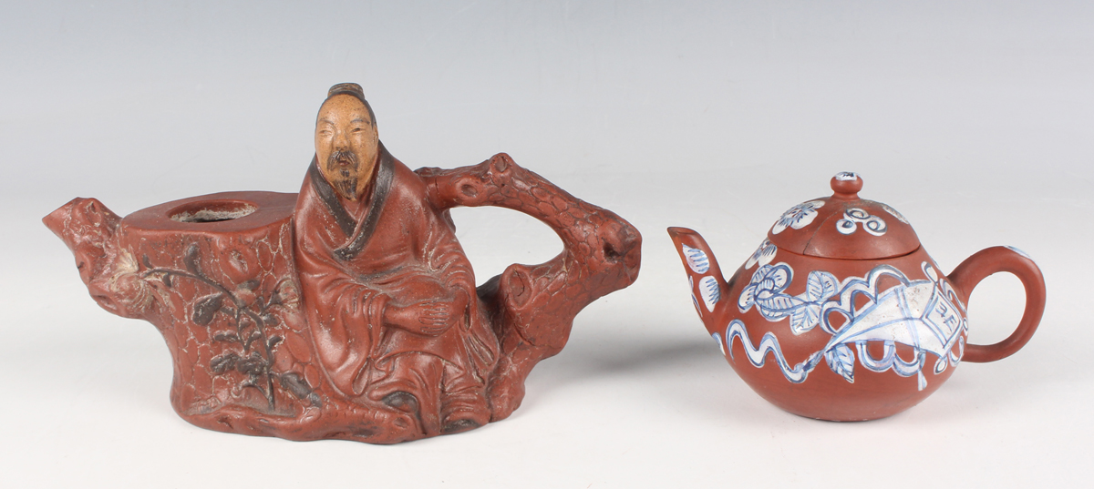 A Chinese blue and white enamelled Yixing stoneware diminutive teapot and cover, late 19th century, of compressed circular form with domed cover and loop handle, impressed seal mark to base, height 5.8cm (cover repaired and chip to spout), together with a Chinese Yixing stoneware water pot, modelled as a sage seated beside a stump and branch, impressed mark to base, height 8.4cm, length 15.5cm (handle repaired).