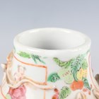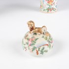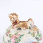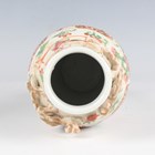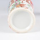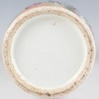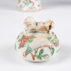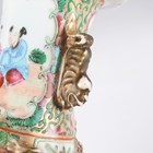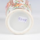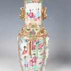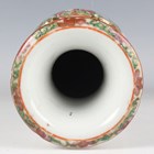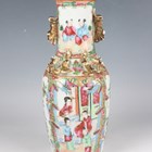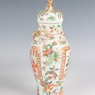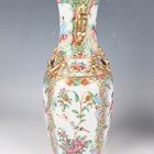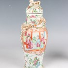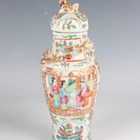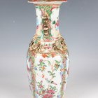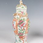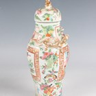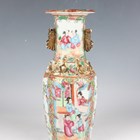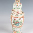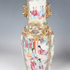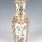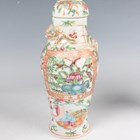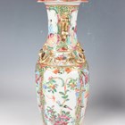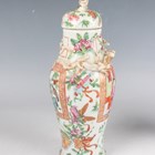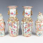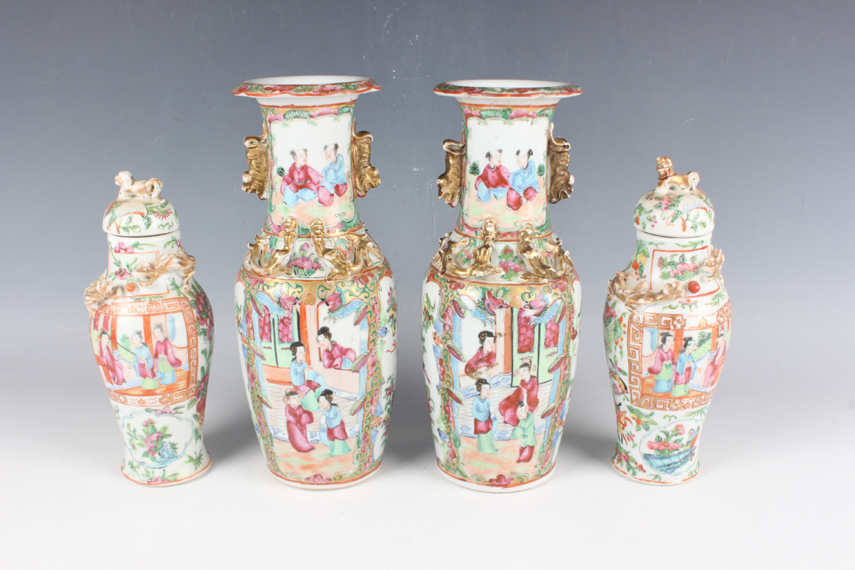 A pair of Chinese Canton famille rose porcelain vases, mid to late 19th century, each shouldered tapering body and flared neck typically painted and gilt with panels of figures, butterflies, birds and flowers, with applied gilt chilong to shoulders and Buddhistic lion handles, height 25.5cm, together with a near pair of similar smaller vases and covers, height 20cm (minor faults).