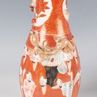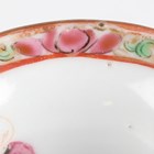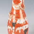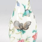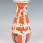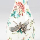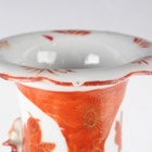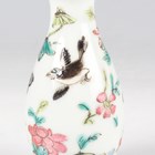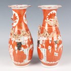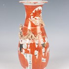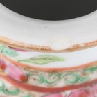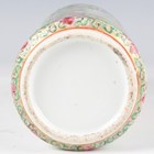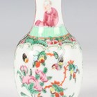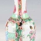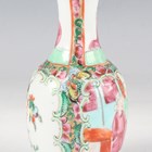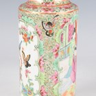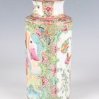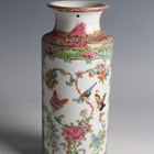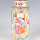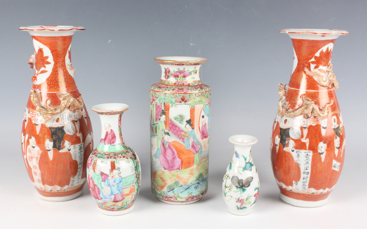 A Chinese Canton famille rose porcelain cylinder vase, mid to late 19th century, typically painted with panels of figures, flowers, birds and butterflies, height 17cm (minor rim chip), together with a pair of Chinese Canton porcelain vases, late 19th century, painted and gilt in the Kutani style with figures, height 20.2cm (chipped and cracked rims), and two small Canton famille rose porcelain vases, heights 8.5cm and 12cm.